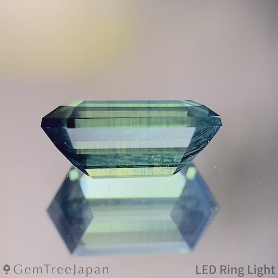 端正なヘキサゴンにステップカットが施され、面で輝くシャープな煌めきと両端に溜まる濃いグリーンが、すっきりとしたシェイプと相まってスタイリッシュな雰囲気です。