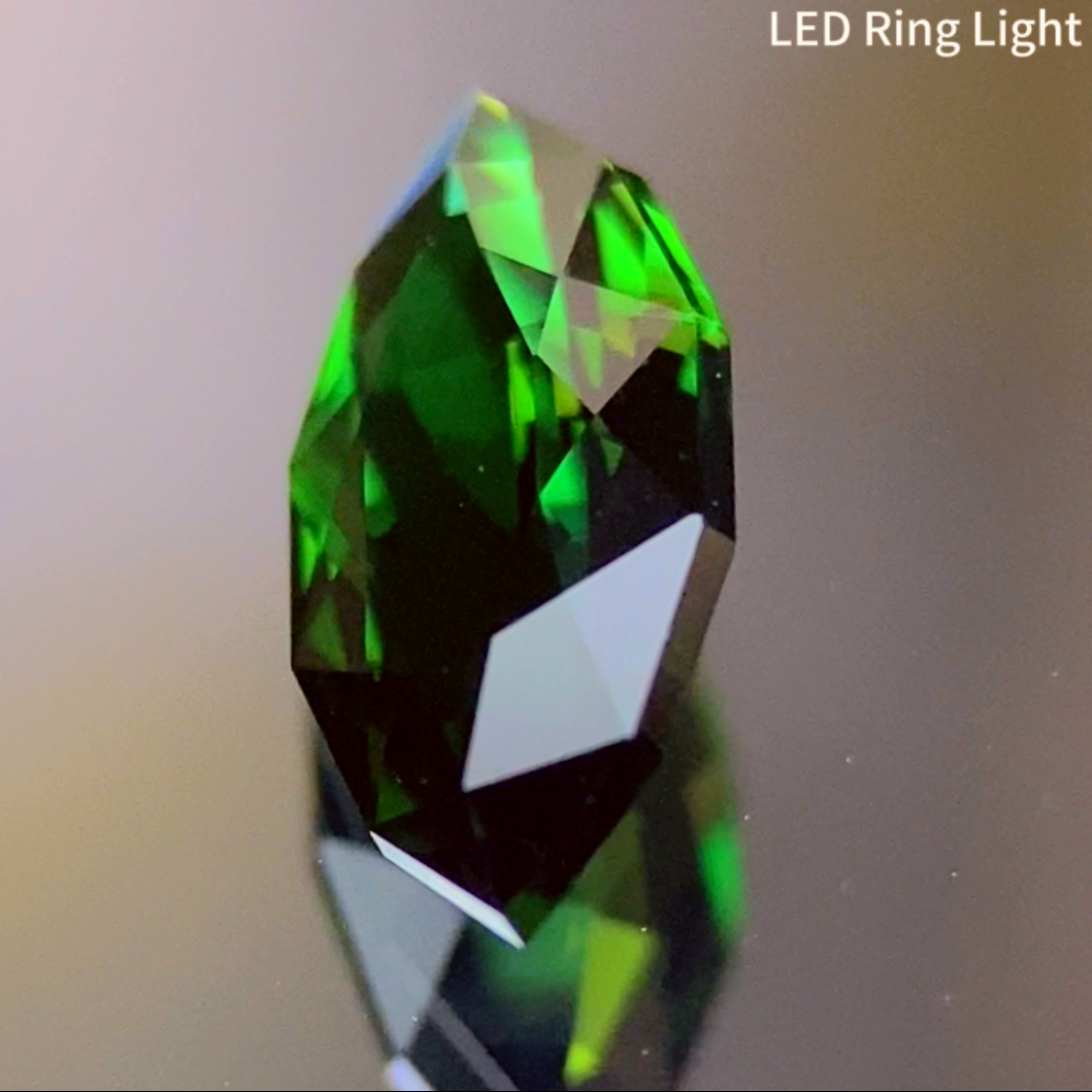 深いフォレストグリーンの地色から、クロムによる鮮やかなグリーンの煌めきを放つタンザニア産のクロムトルマリンで、原石から輪郭を細かく縁取ったファンシーペアシェイプに仕上げた作品です。