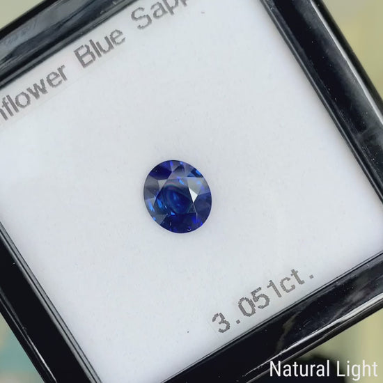 ビルマ産らしい濃厚なロイヤルブルーと、ほんのりグリーンを噛んだブルーが混ざり合う煌めきを放つコーンフラワーブルーサファイア。