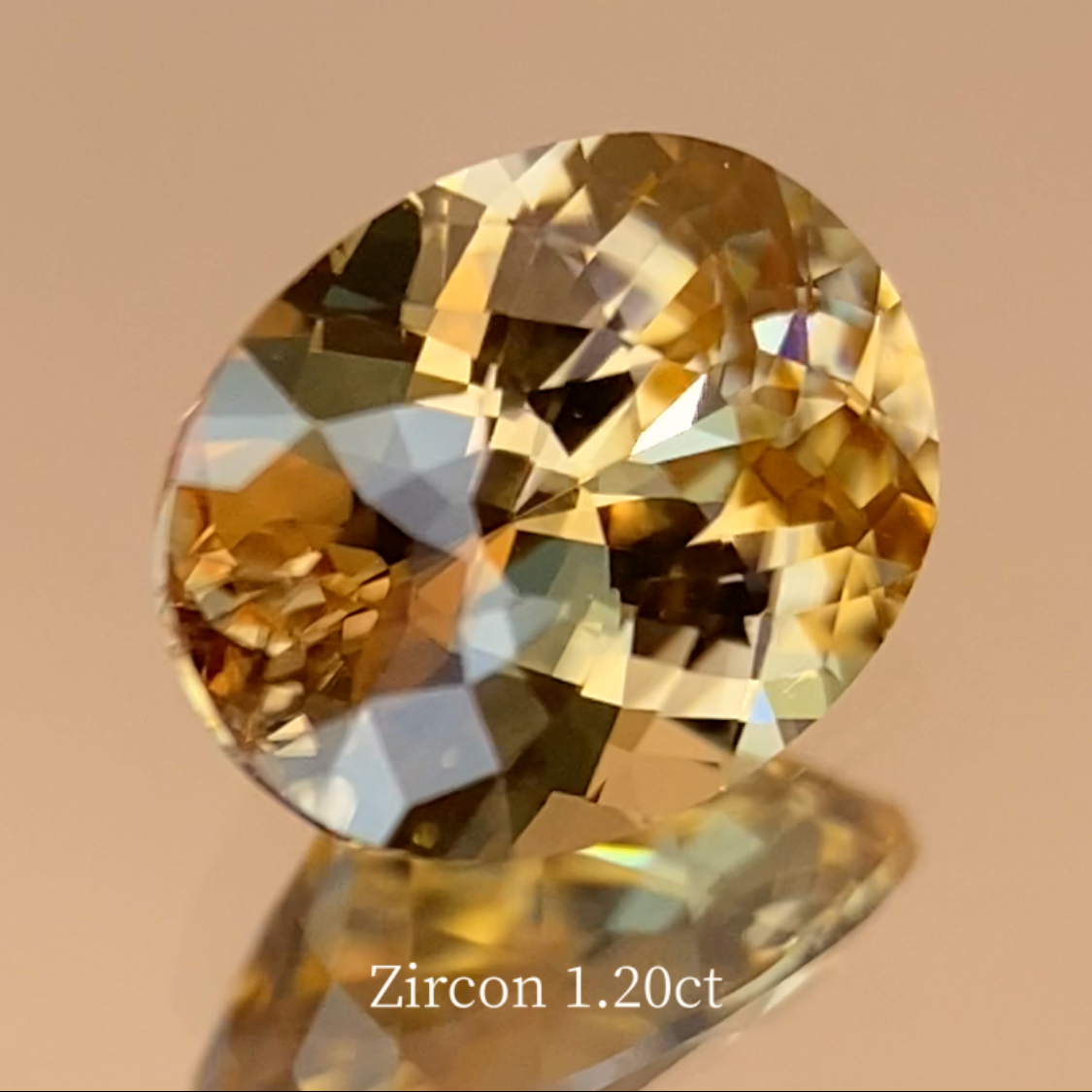 オレンジの軽い色だまり感と地色に感じるグリーンが良い雰囲気のゴールドジルコンで、スタンダードなオーバルシェイプをテーブルを小さくして細かいフラワーカットを敷き詰めたチャギラカットに仕上げた一石です。