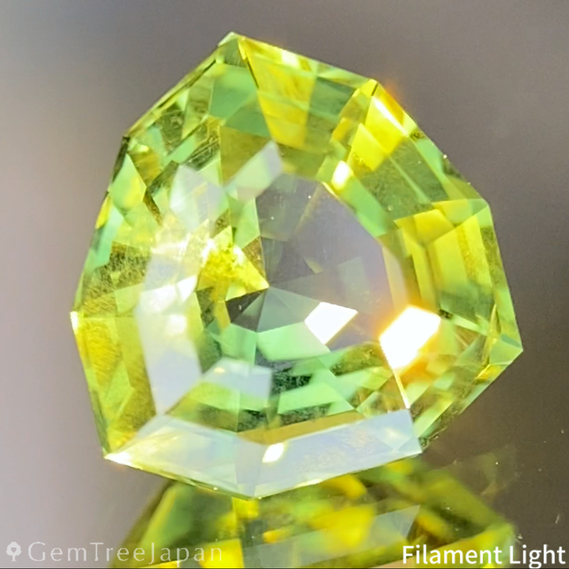 イエロー寄りのグリーンをベースに、ゴールドのシルクインクルージョンが全体に散りばめられたナイジェリア産サファイア。