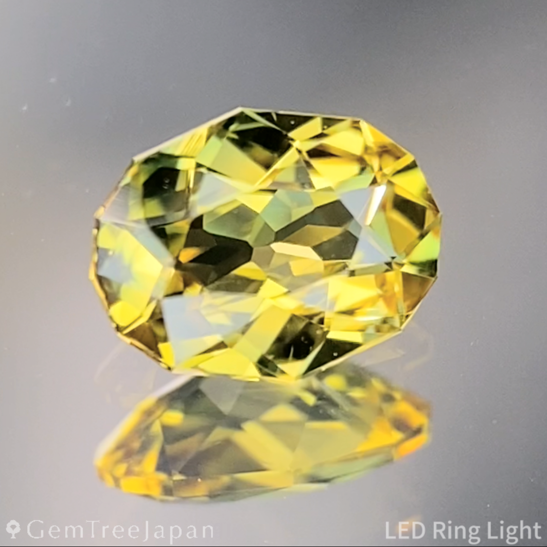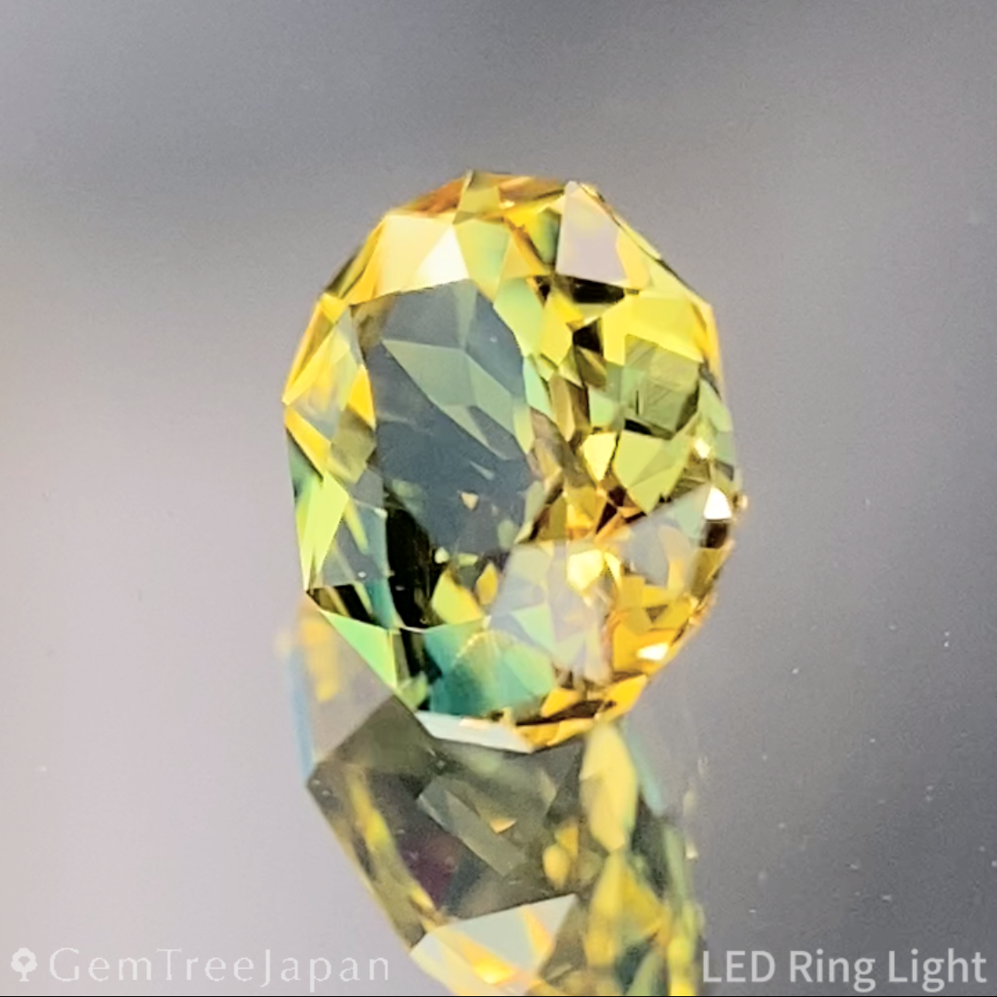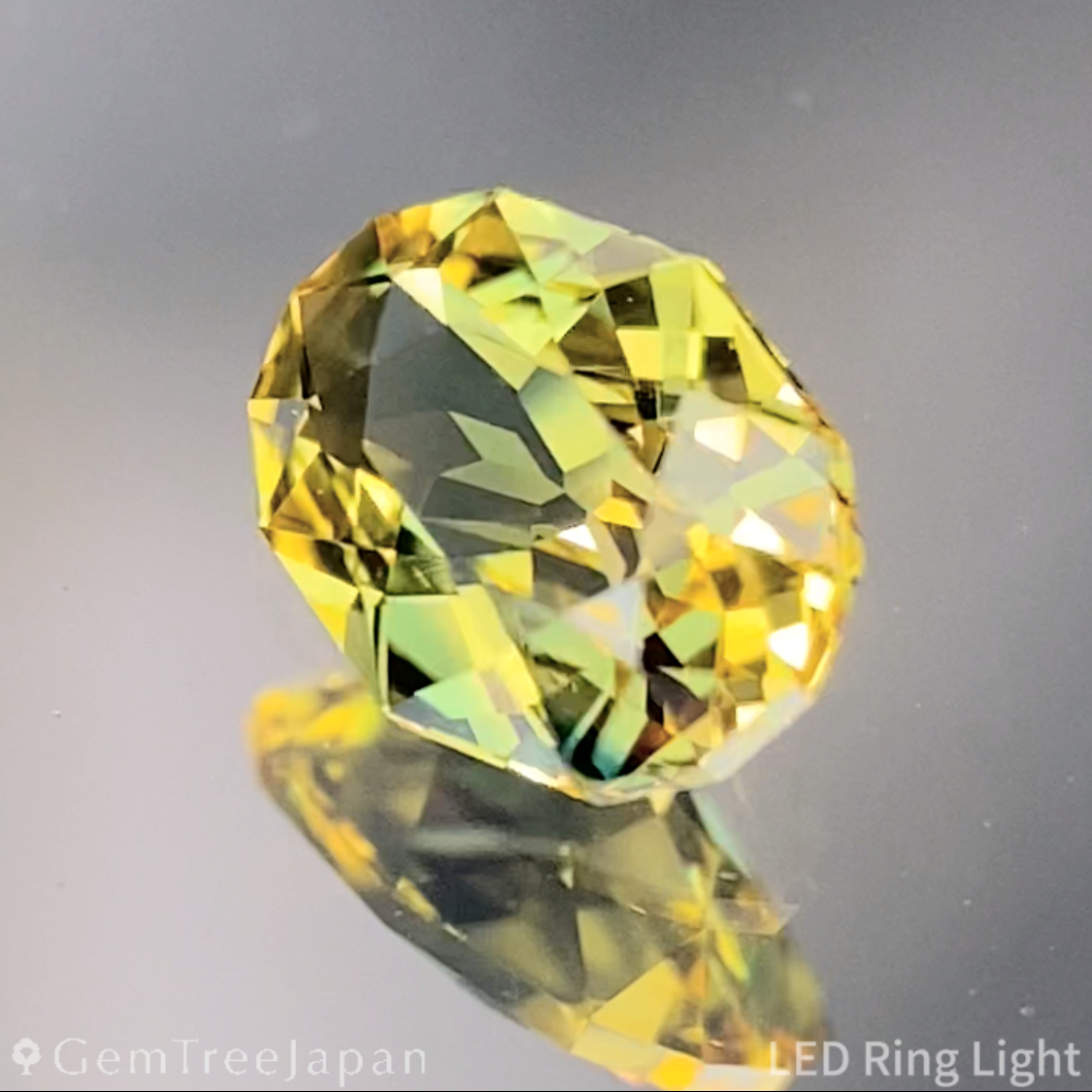 光を受ける角度によってイエローが両端に濃く集まり、グリーンのテリがふっと表情を変える瞬間は、この石ならではの見応えです。