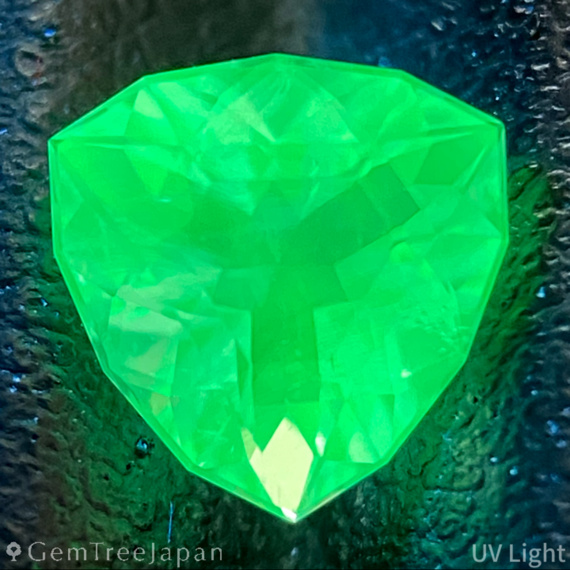 含有するウランによって、波のように流れる成長線と角度によって濃淡のあるネオングリーンの蛍光反応が大変美しいです。