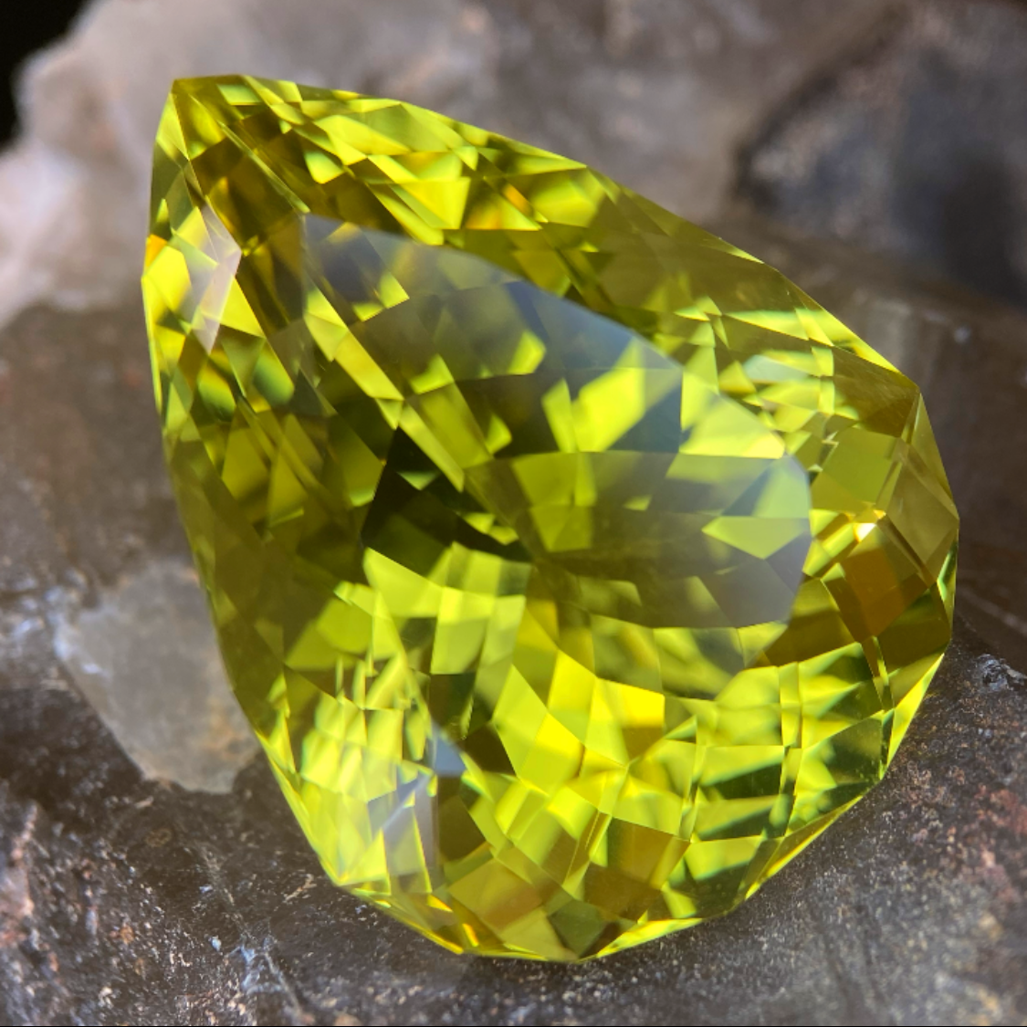 グリーンを噛んだ鮮やかなイエローが美しい45ctアップのレモンクォーツで、内包物の無い大粒の美結晶を輪郭を細かく縁取ったファンシーペアシェイプに仕上げた作品です。