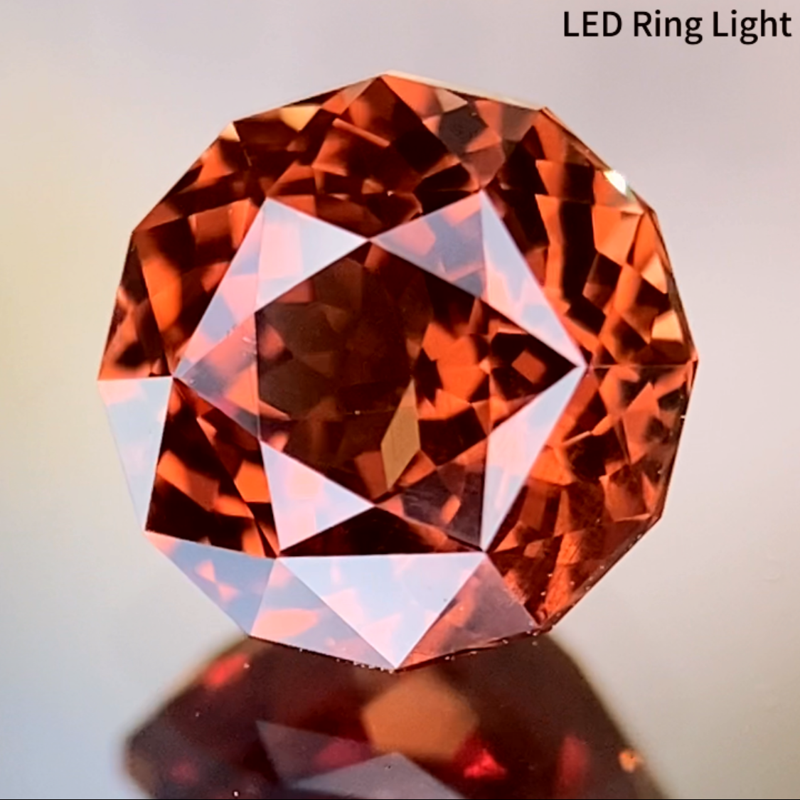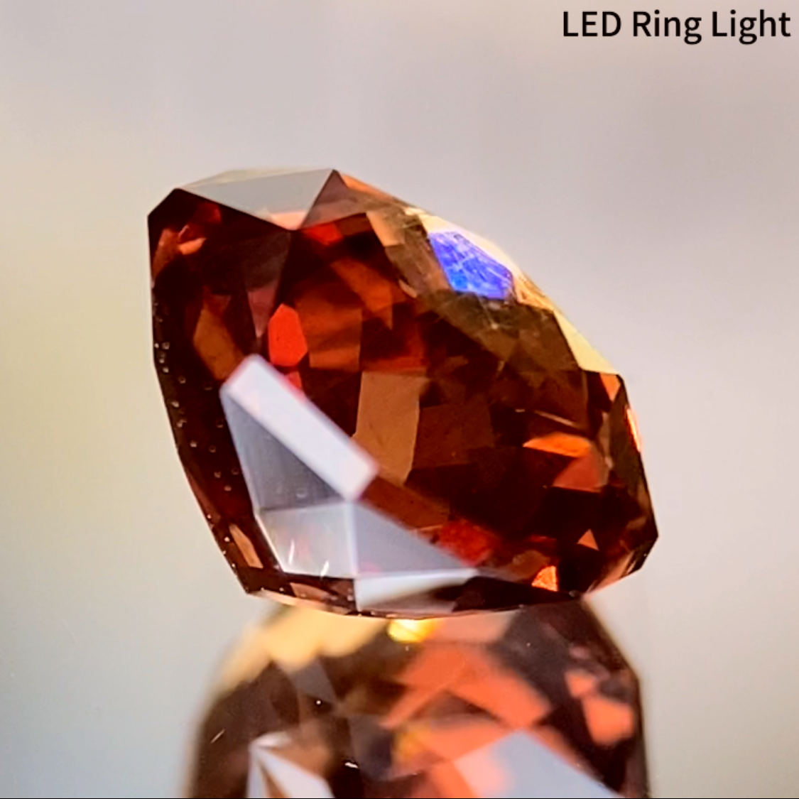 濃厚なブラウンの地色からコクがあって鮮やかなオレンジの煌めき溢れる3種混合のパイラルスパイト/マラヤガーネットで、輪郭を細かく縁取ったファンシーラウンドに仕上げた作品です。