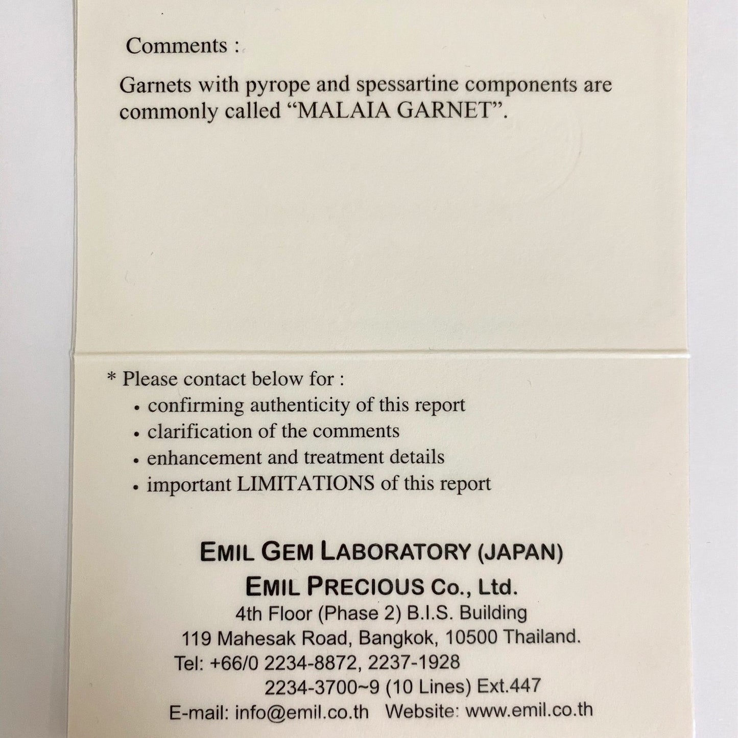 赤みの効いた濃厚なピンクの地色から、鮮やかなピンクの煌めきとオレンジの煌めきを放つマラヤガーネットで、18ctの原石からラウンドシェイプに仕上げた作品です。