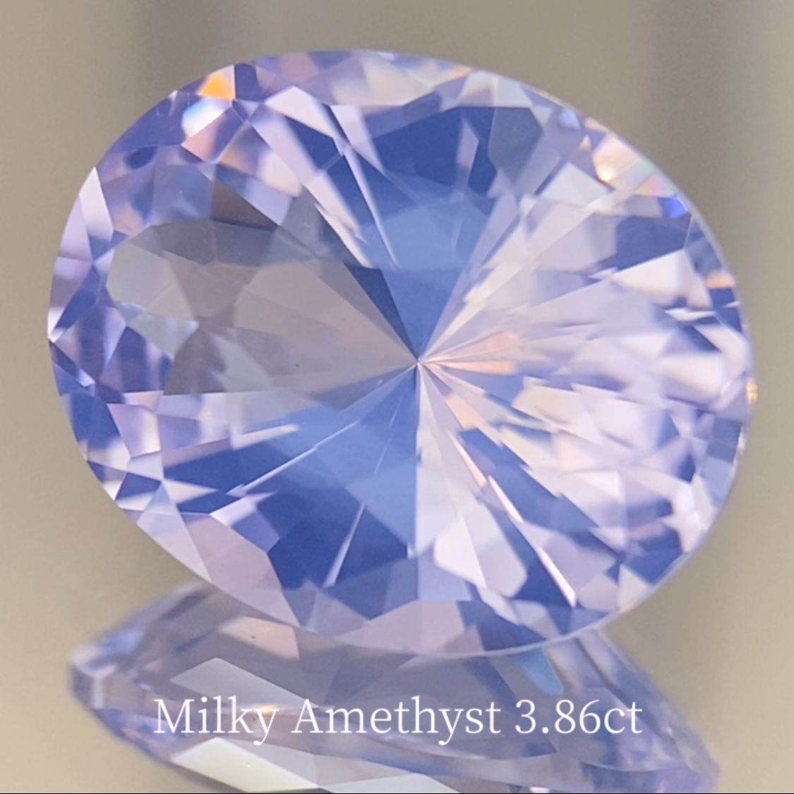 ミルキーなラベンダーカラーが可愛い4c'近い迫力のあるミルキーアメジストで、スタンダードなオーバルシェイプに、パビリオン側はタイ語で時計を意味するナリカーカットに仕上げ、クラウン側にはテーブルを小さくしてフラワーカットを敷き詰めた超ギラカットを施した一石です。