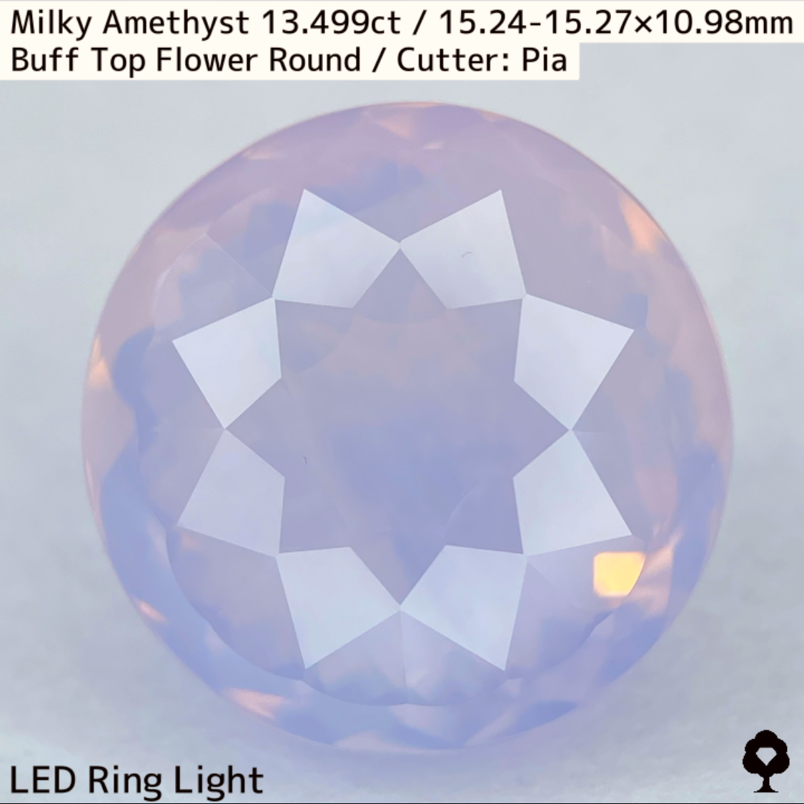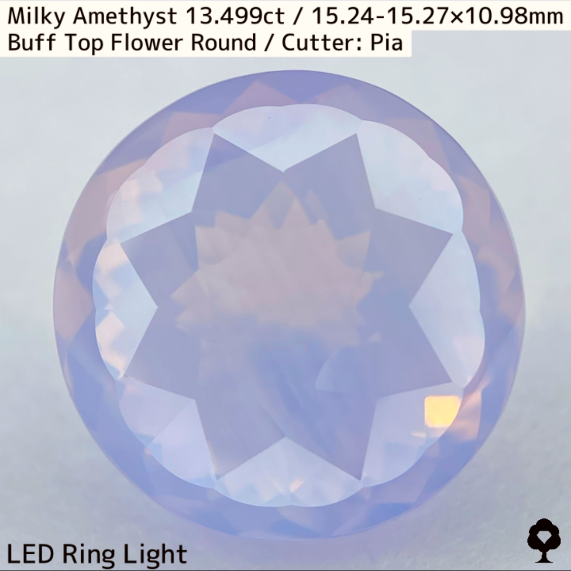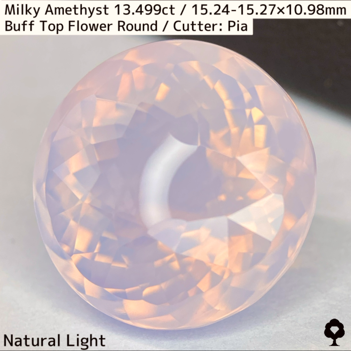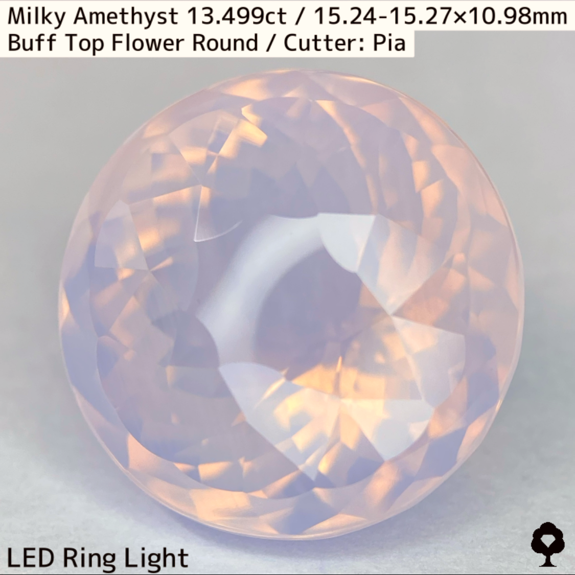 13ctアップの大粒の全体がミルキーな石質からオレンジの煌めきが溢れるミルキーアメジストで、バフトップにフラワーカットが浮かぶ、テーブルもバフトップの新カットです。