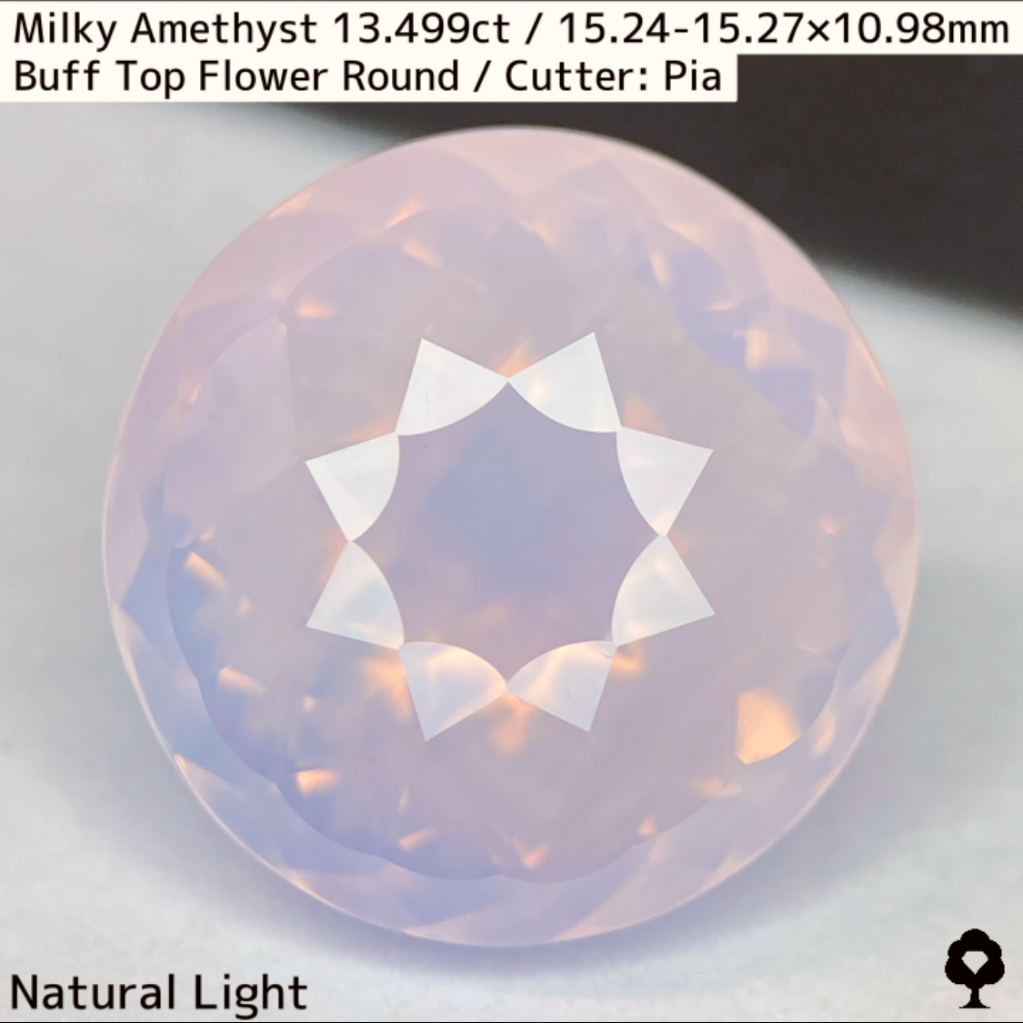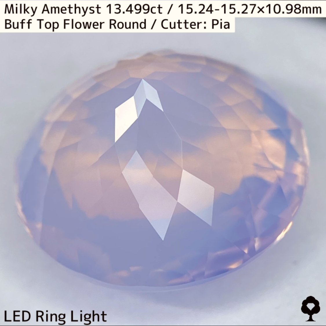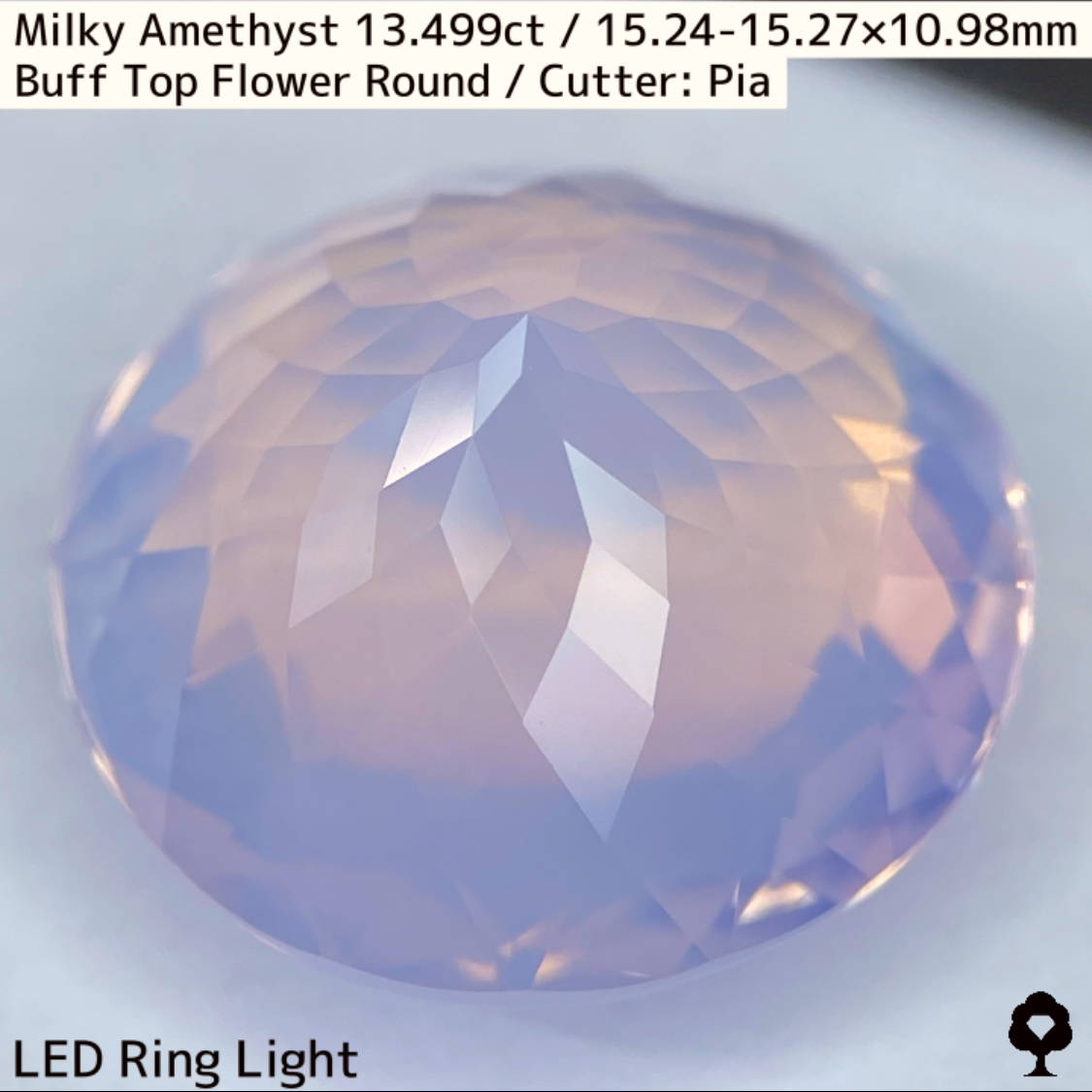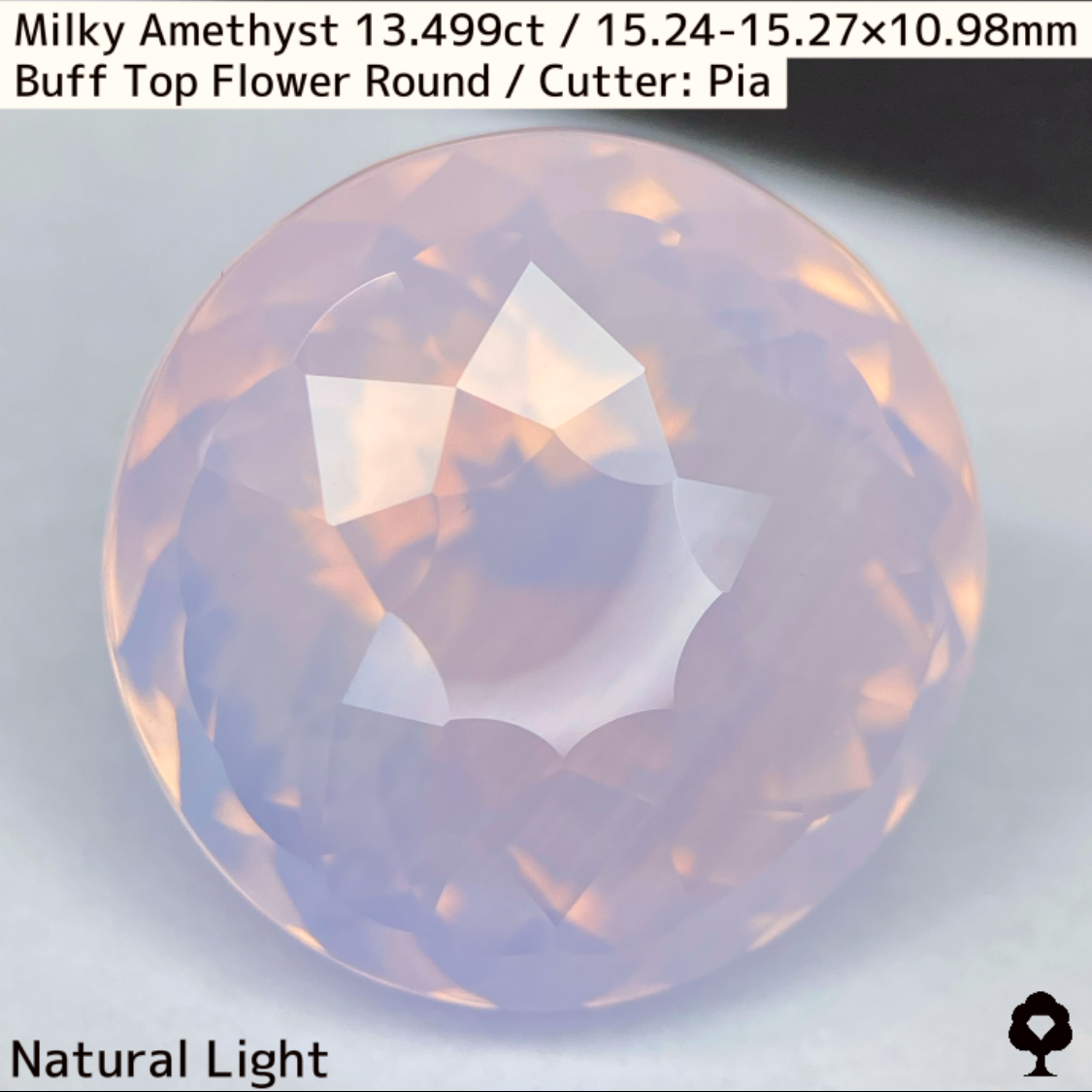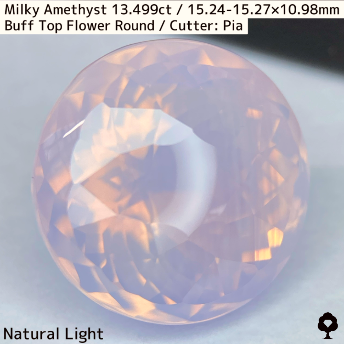 13ctアップの大粒の全体がミルキーな石質からオレンジの煌めきが溢れるミルキーアメジストで、バフトップにフラワーカットが浮かぶ、テーブルもバフトップの新カットです。
