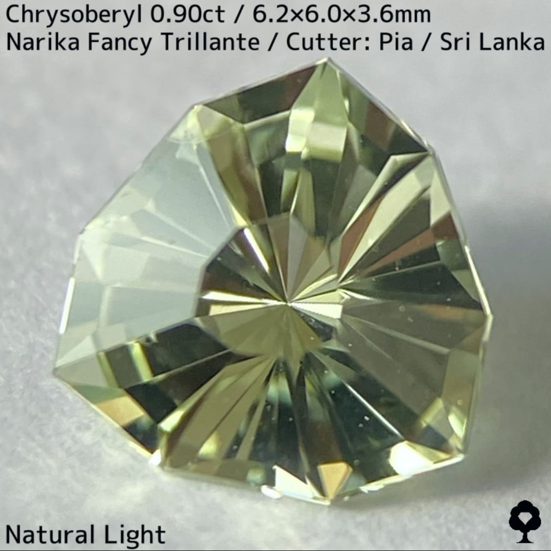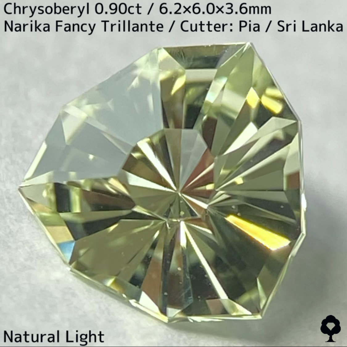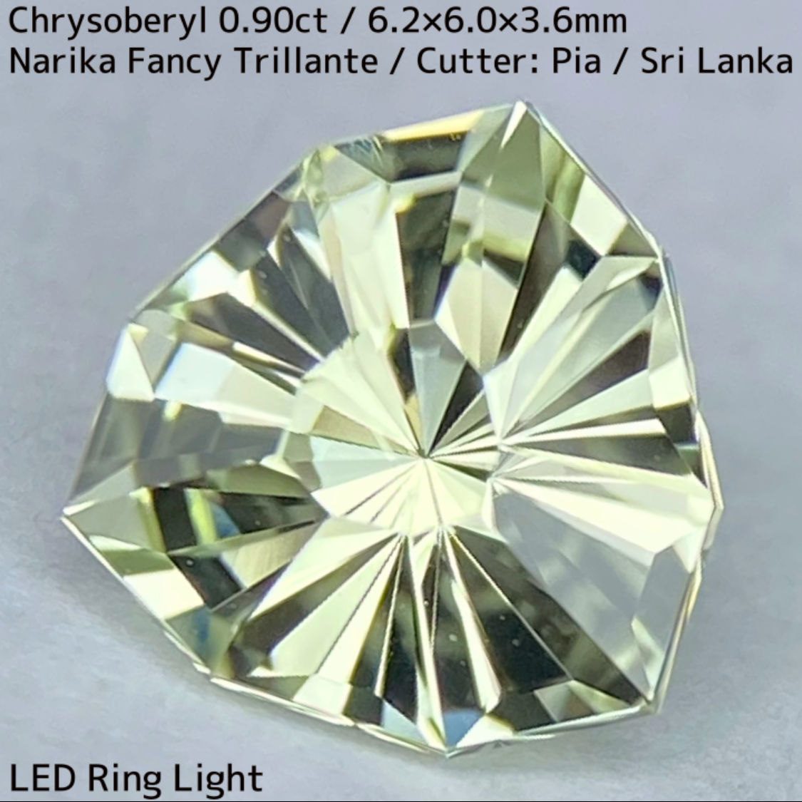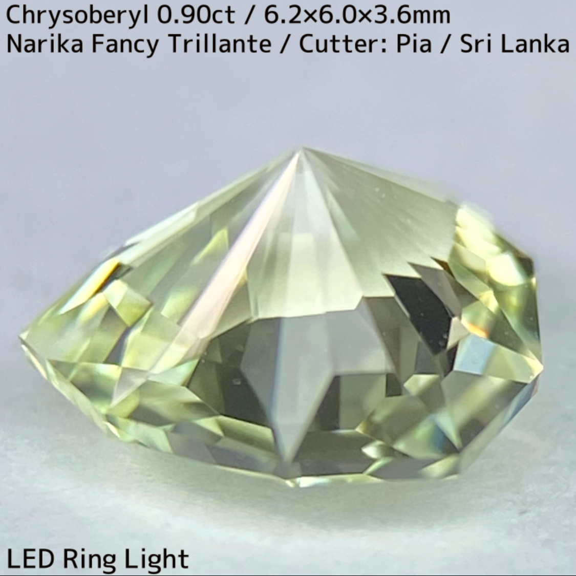 ライトグリーンの煌めきの強いクリソベリルで、輪郭を縁取ったファンシートリリアントに仕上げた一石です。