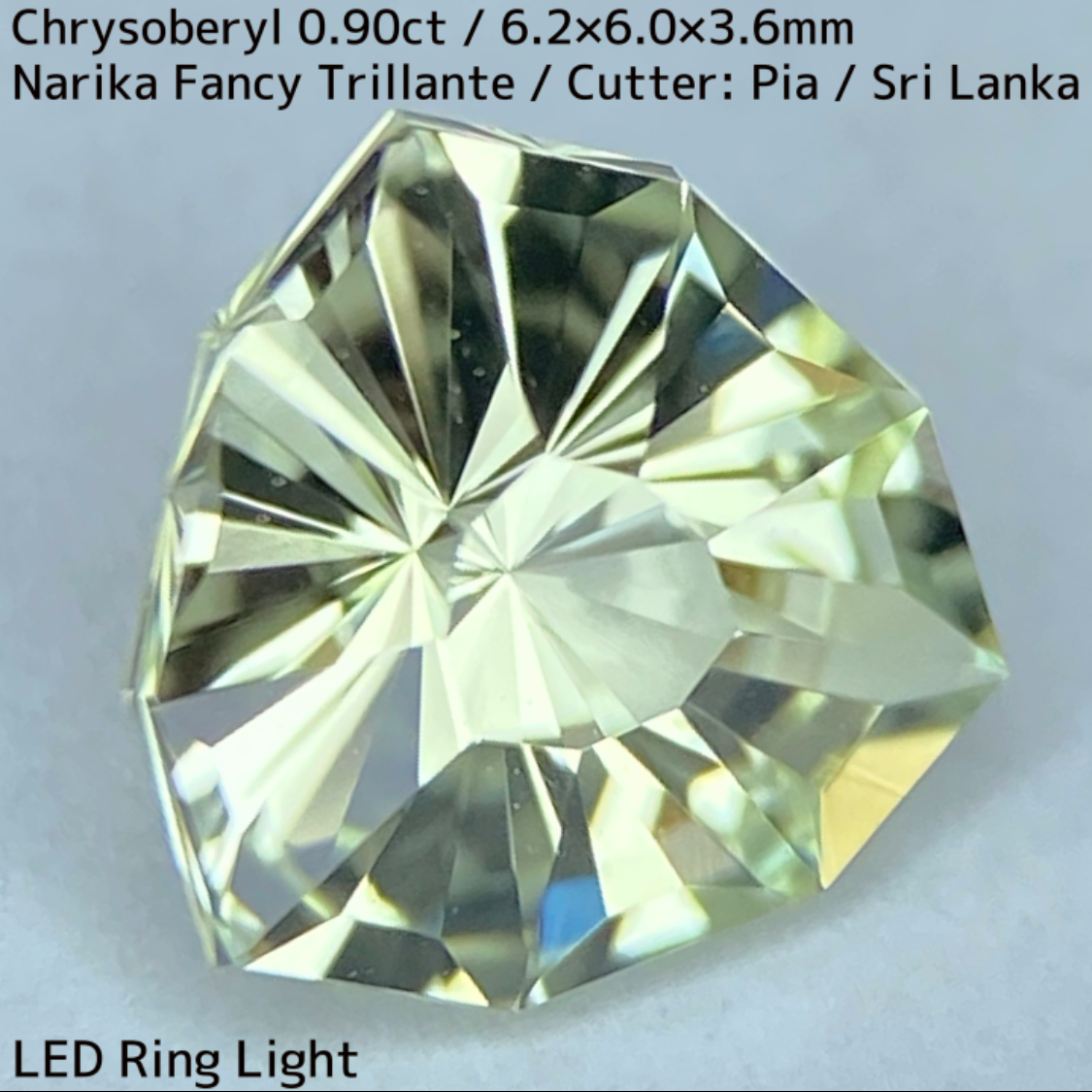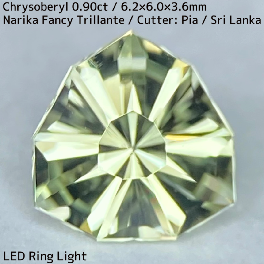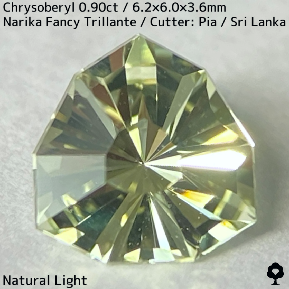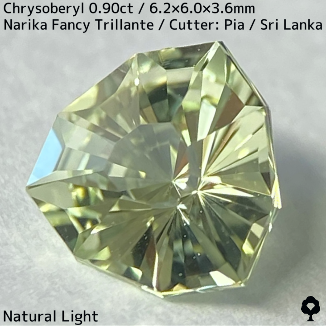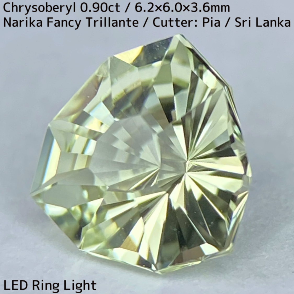 ライトグリーンの煌めきの強いクリソベリルで、輪郭を縁取ったファンシートリリアントに仕上げた一石です。
