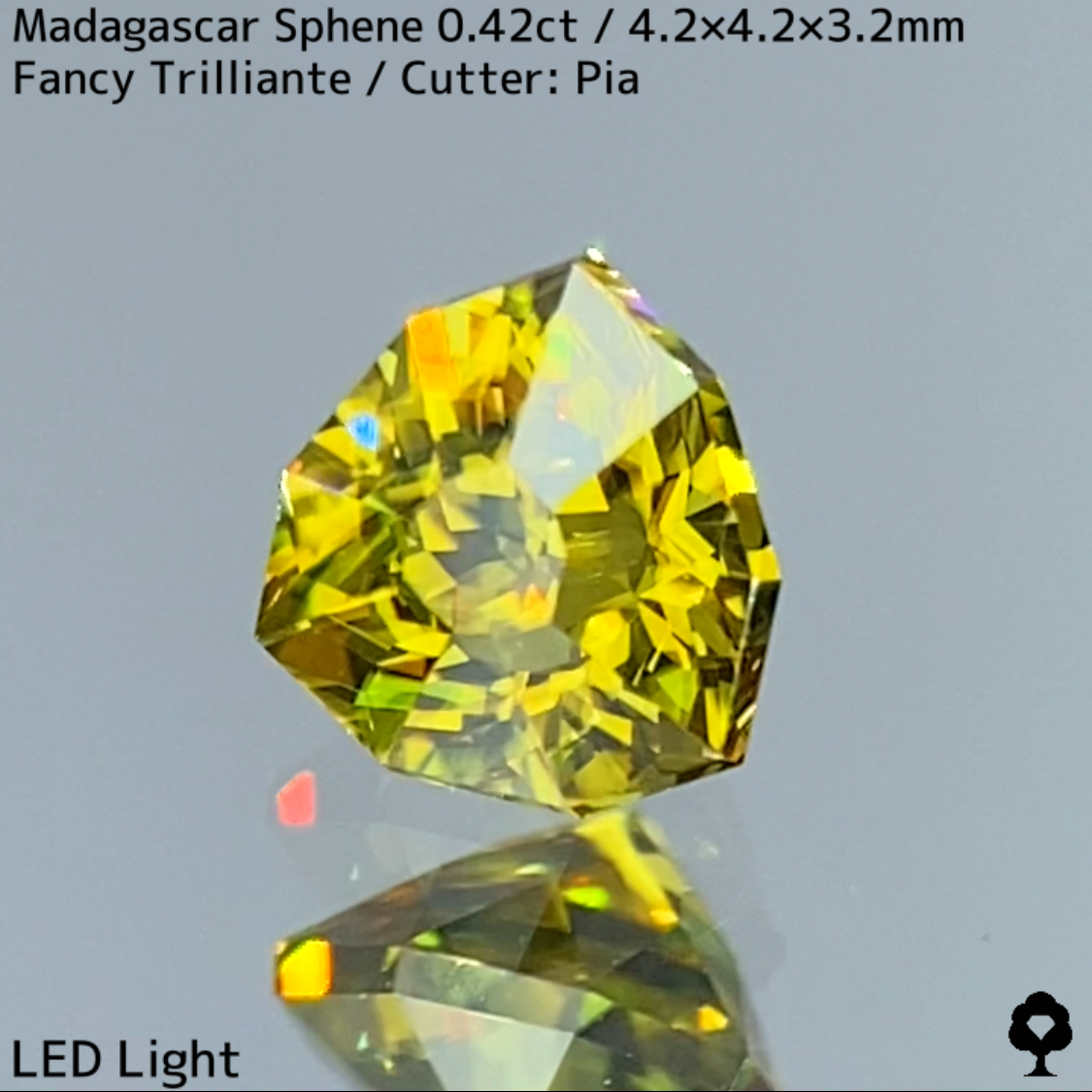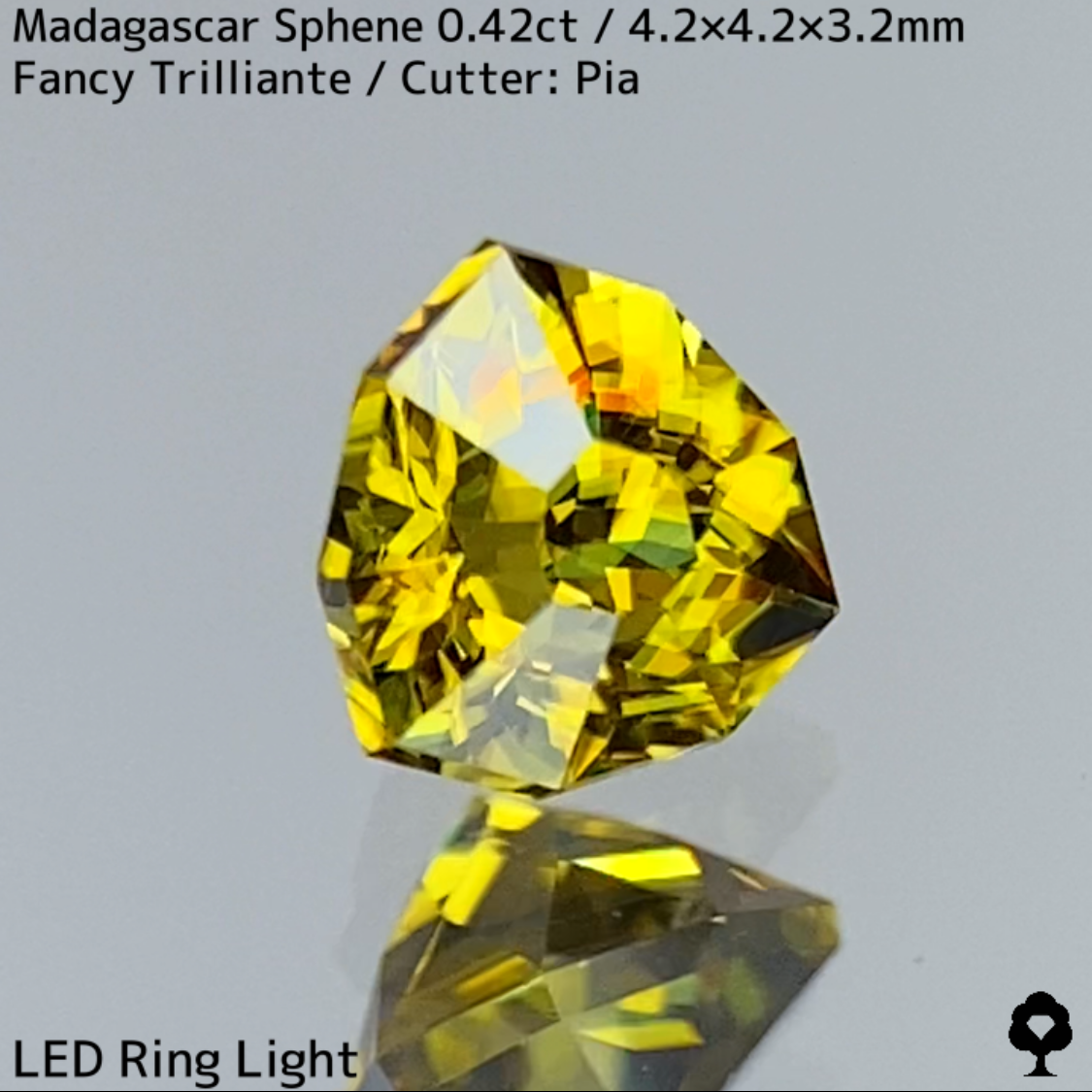 正統派ゴールドと言える色合いの内包物の無い美結晶マダガスカルスフェーンで、ファンシートリリアントのフラワーカットに、クラウン側をシンプルなファセットに仕上げた新カットです。