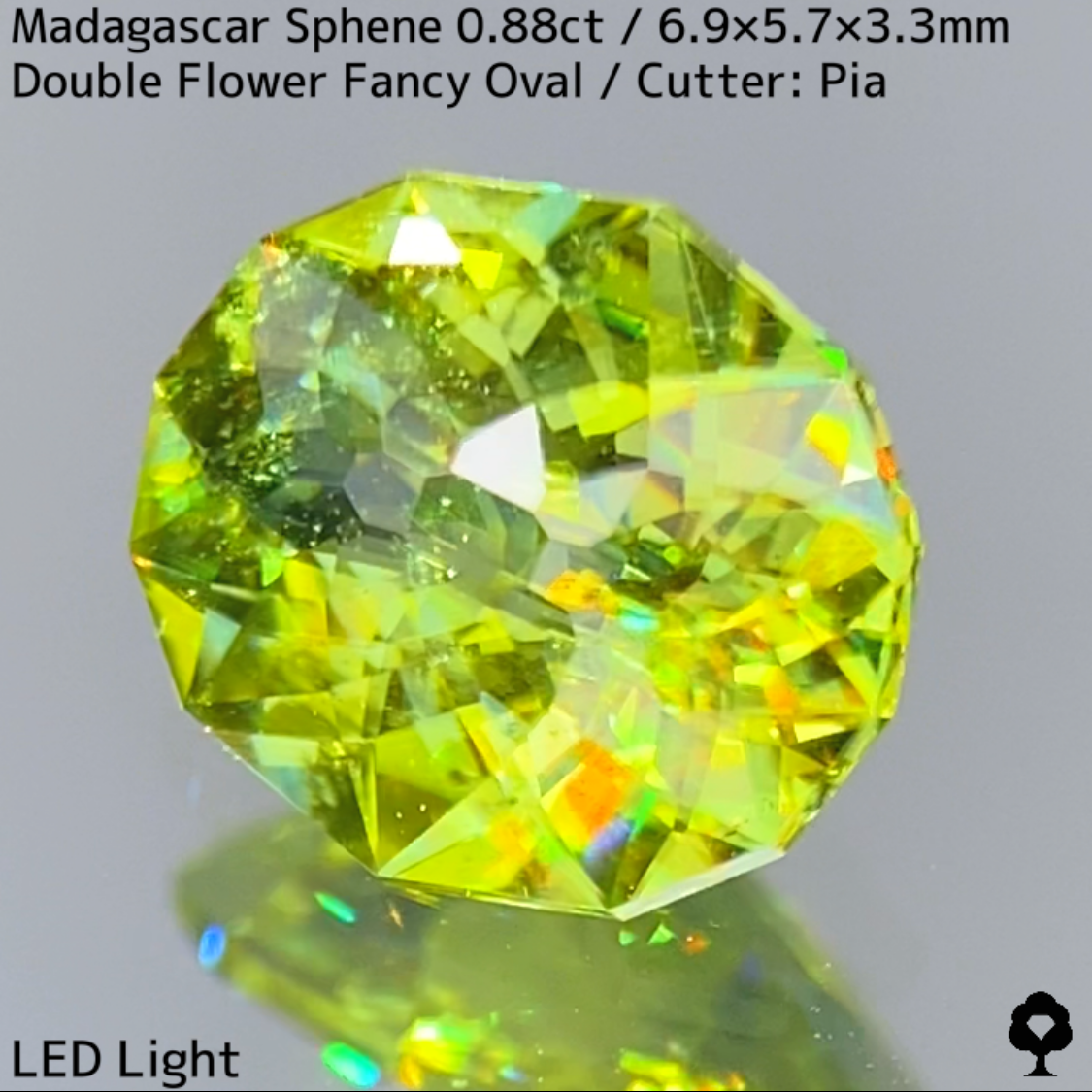 爽やかなイエローイッシュグリーンのマダガスカル産スフェーンを、両面ギラギラな両ギラカットの進化版である超ギラカットのクラウン・パビリオンをダブルでフラワーカットの新カットに仕上げました。