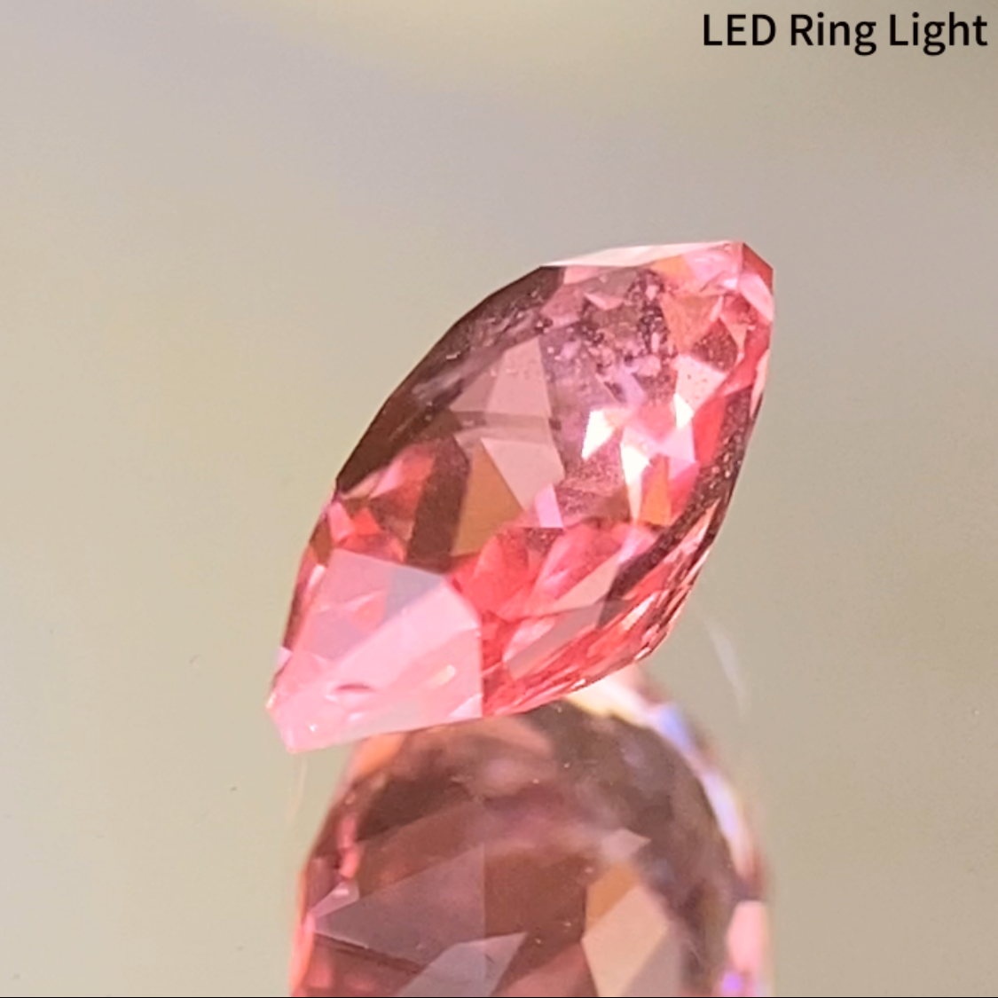 ペアシェイプの先端と丸み側にネオンパパラチァカラーの色だまりが美しく、フラワーカットによる細やかな煌めきにはパープルも感じられて、カラフルなファイアーもチラつきます。