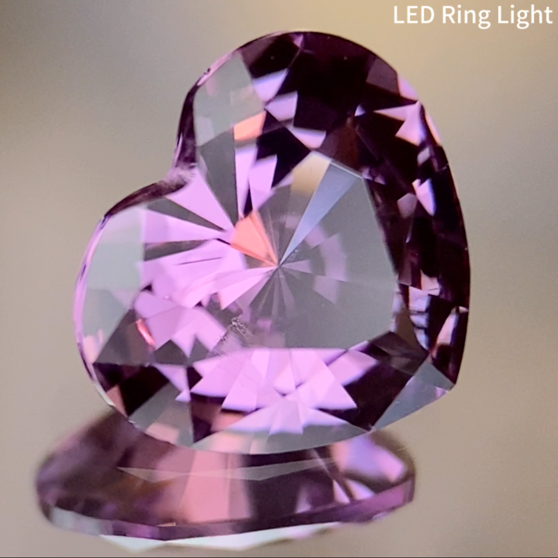 パープルにオレンジが混ざりピンキッシュパープルの煌めきを放つタンザニア産のスピネルで、原石からハートシェイプに仕上げた作品です。