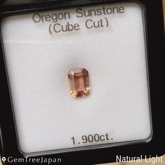 柔らかなピッキッシュオレンジとシャンパンゴールドのパーティ感あるオレゴンサンストーンで、オクタゴンシェイプのクラウン側に立体的な形が浮かぶキューブカットが施された作品です。