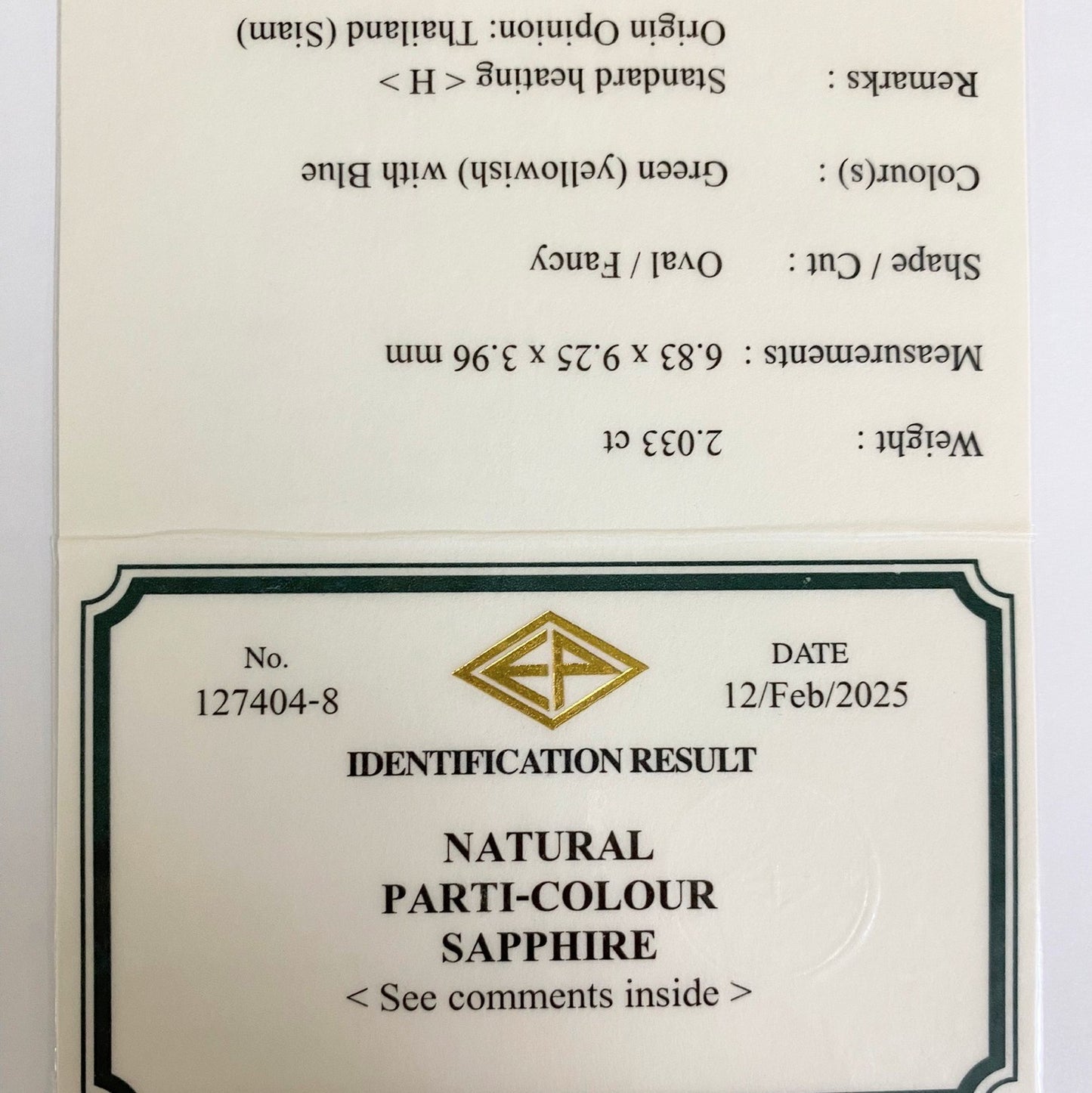 イエローイッシュグリーンに深いブルーの色だまりがある孔雀のようなカラーのタイ東部バンカチャ産のパーティカラーサファイアです。