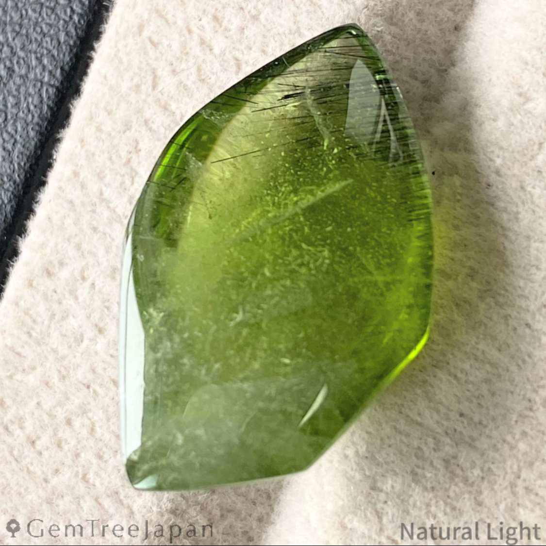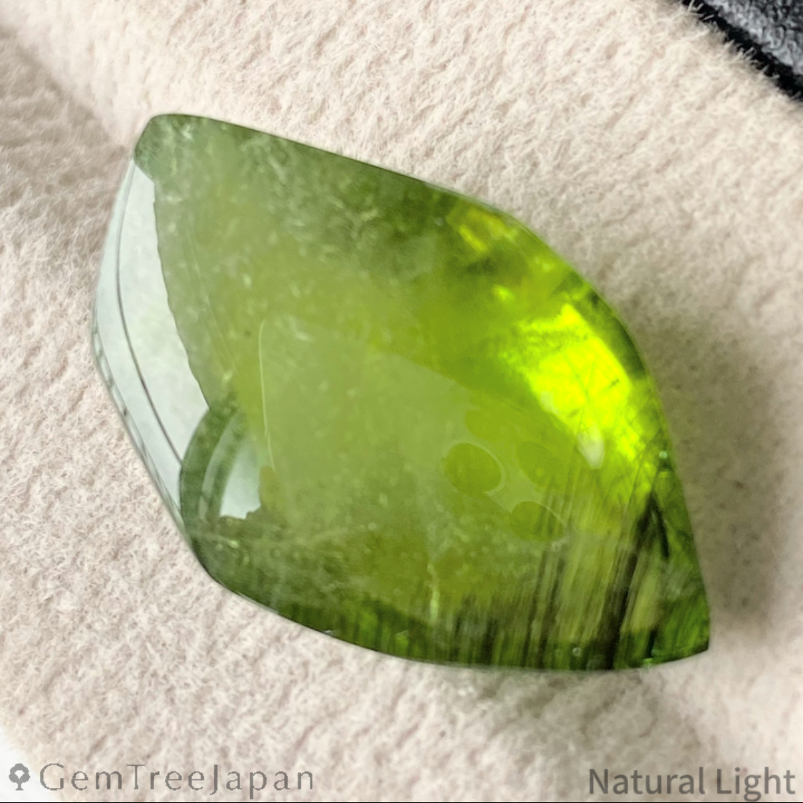 パキスタン産らしい少し青みのある明るいイエローイッシュグリーンのペリドットで、新芽のようなシェイプのカボションに仕上げた20ctに迫る巨石作品です。