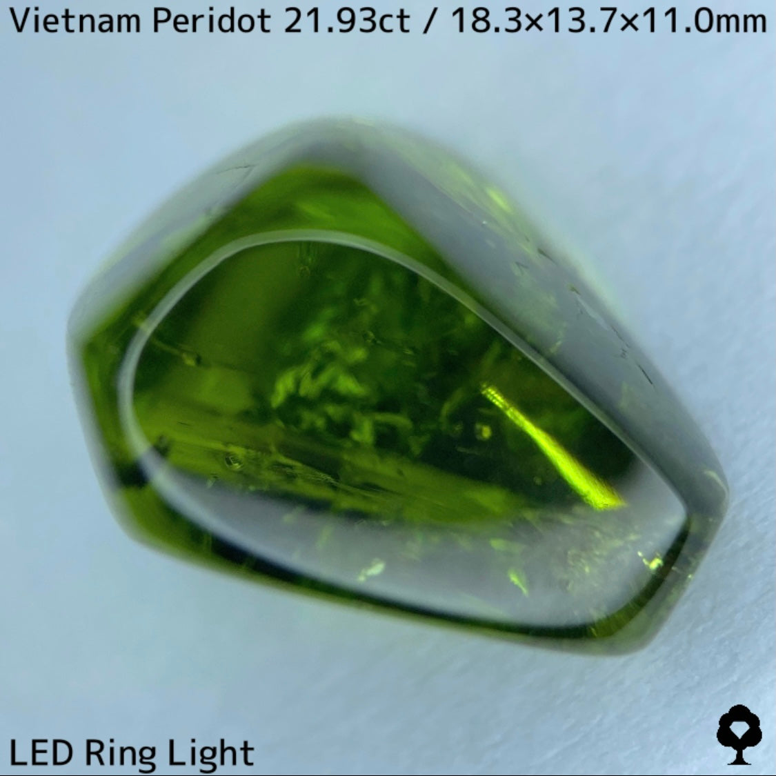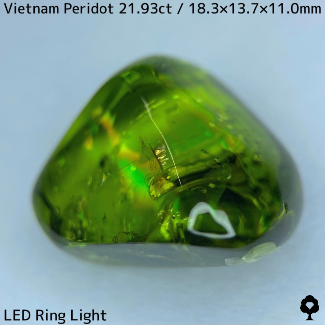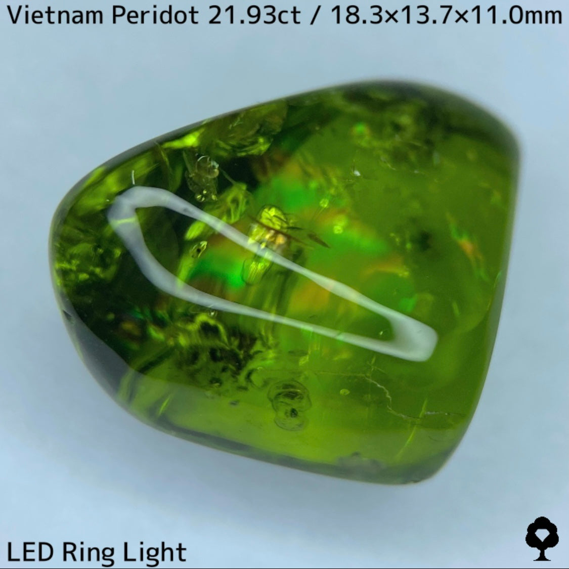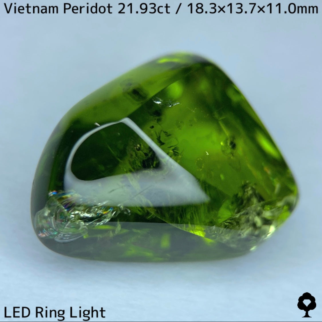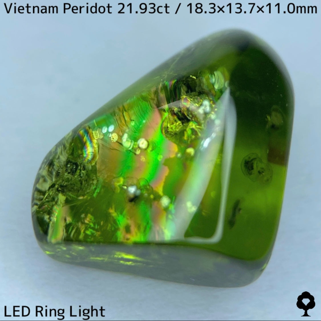 濃厚で鮮やかなクオリティの高いオリーブグリーンの結晶で、内部の層状の内包物によって大きく虹色が出てきていて一面は虹色が敷き詰められており、その上をペリドット特有のリリーパッド(円盤状の亀裂)が浮かぶ一石です。