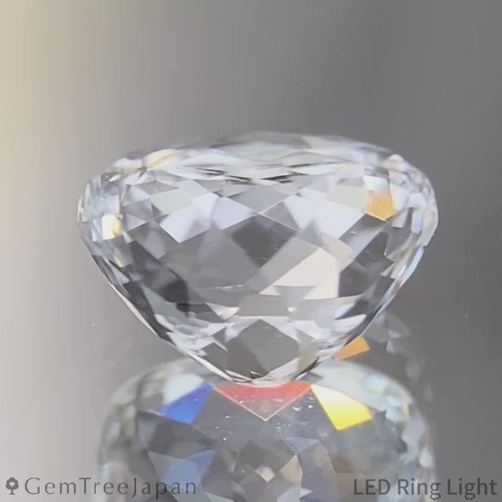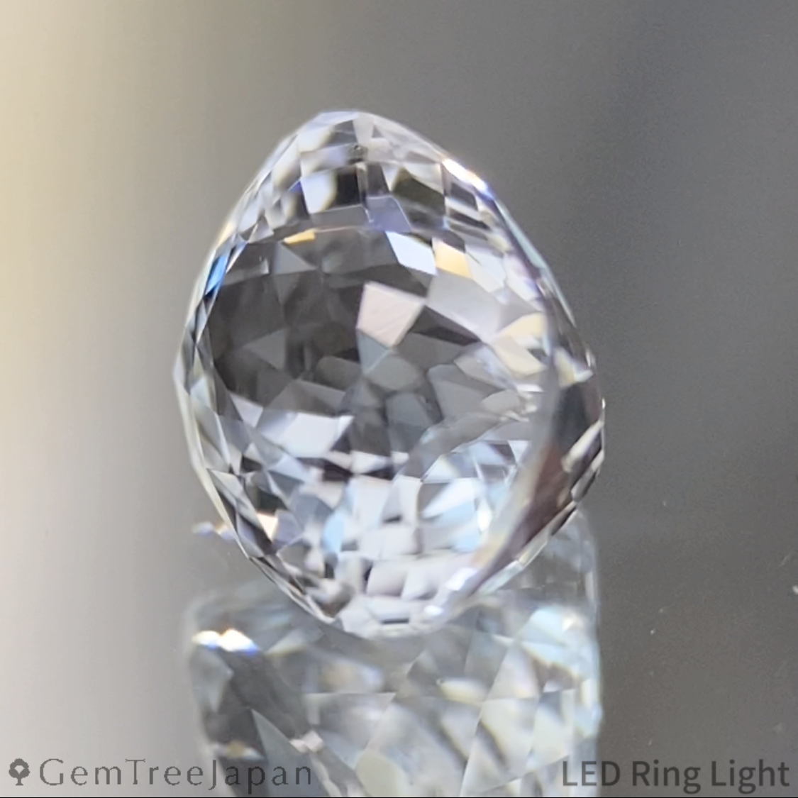 クラウン側はふくらみを持たせたプロポーションで構成され、テーブルの周りから細かなフラワーカットを施し、純白に近いフェナカイト特有の高い屈折率による、シャープかつ立体的なブリリアンスを最大限に引き出しています。