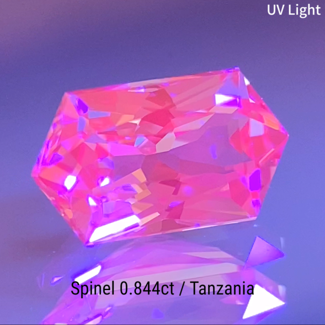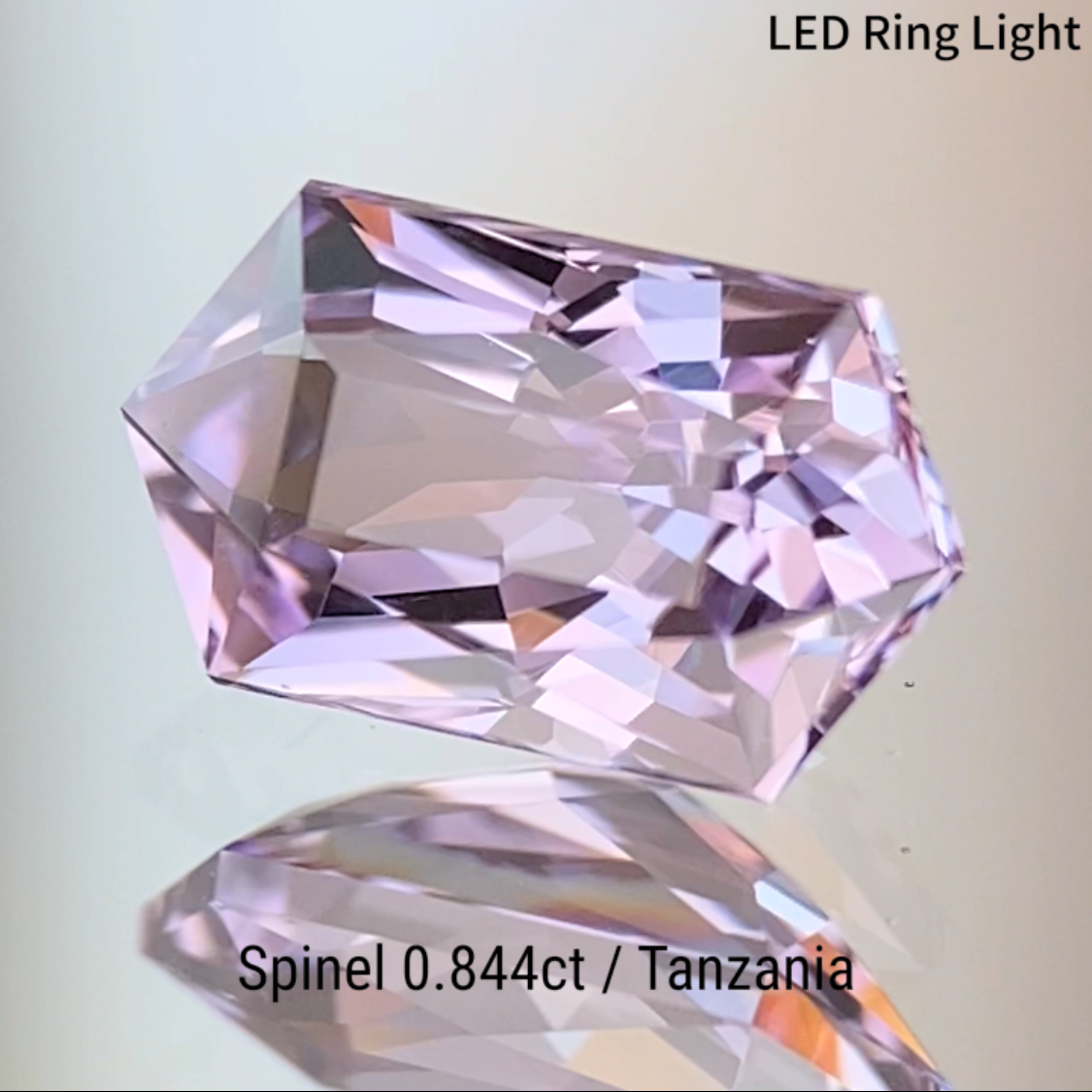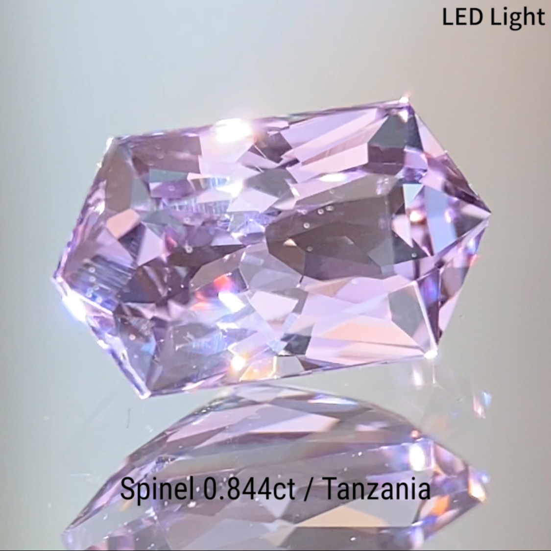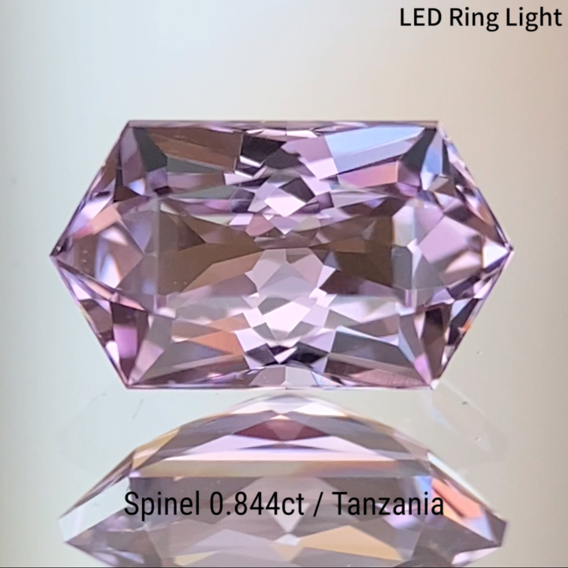 柔らかなピンクとヴァイオレットが混ざり合うライトラベンダーカラーのタンザニア産スピネルで、長い六角形の輪郭に複雑なカットを施した作品です。
