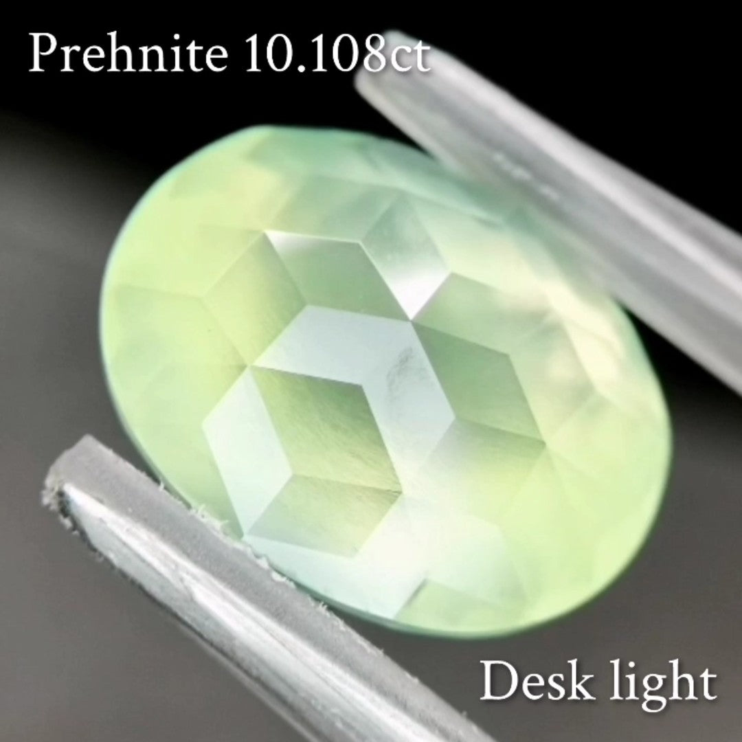 半透明な青みのあるグリーンの地色から、グリニッシュイエローの柔らかなテリが浮かぶオーストラリア産のプレナイトで、オーバルシェイプに箱の形が全面に浮かぶフルキューブカットが施されたGTJオリジナルカットの作品です。