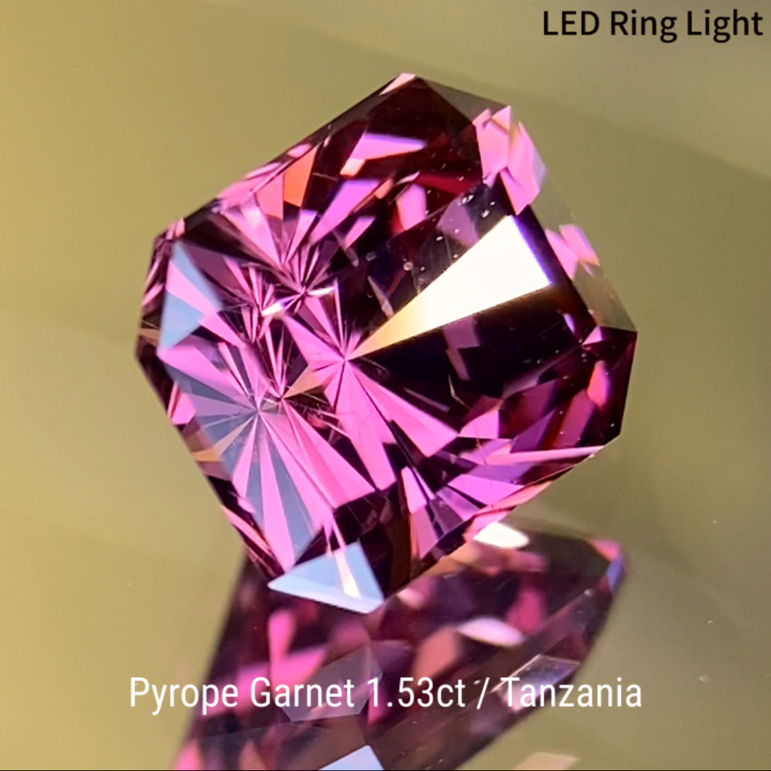 ピンクガーネットと言える色合いのタンザニア産パイロープガーネットで、オクタゴンシェイプにタイ語で時計を意味するナリカーカットを施した作品です。