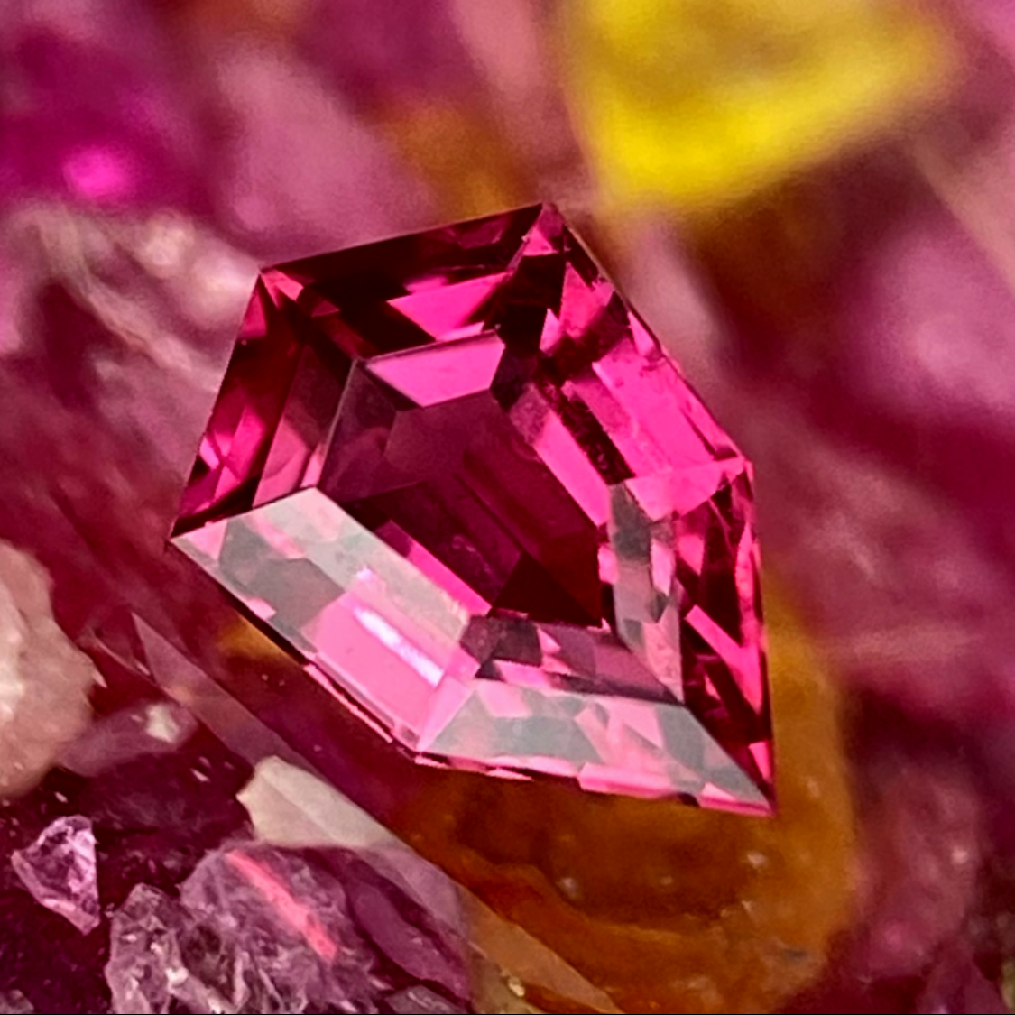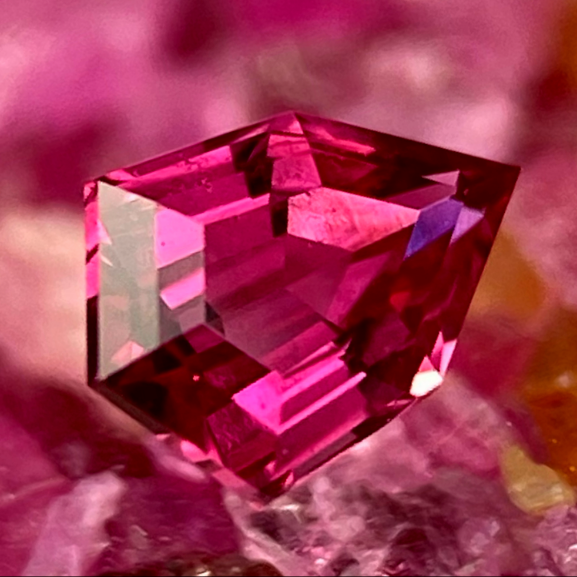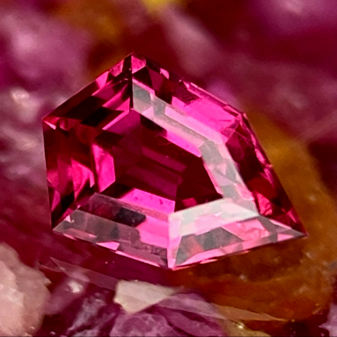 濃厚なレッドの地色から鮮やかなピンクとレッドの煌めきを放つタイ産のルビーで、矛のようなたてのようなシャープなシェイプに仕上げたコランダム専門店のGTJらしい贅沢な作品です。