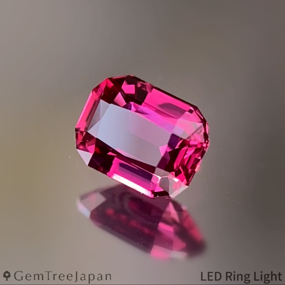 カットによる鋭い光とともにピンクやレッドが現れて、カラーの持つ力強さがより強調されるステップカットならではの煌めきが大きな魅力のひとつです。