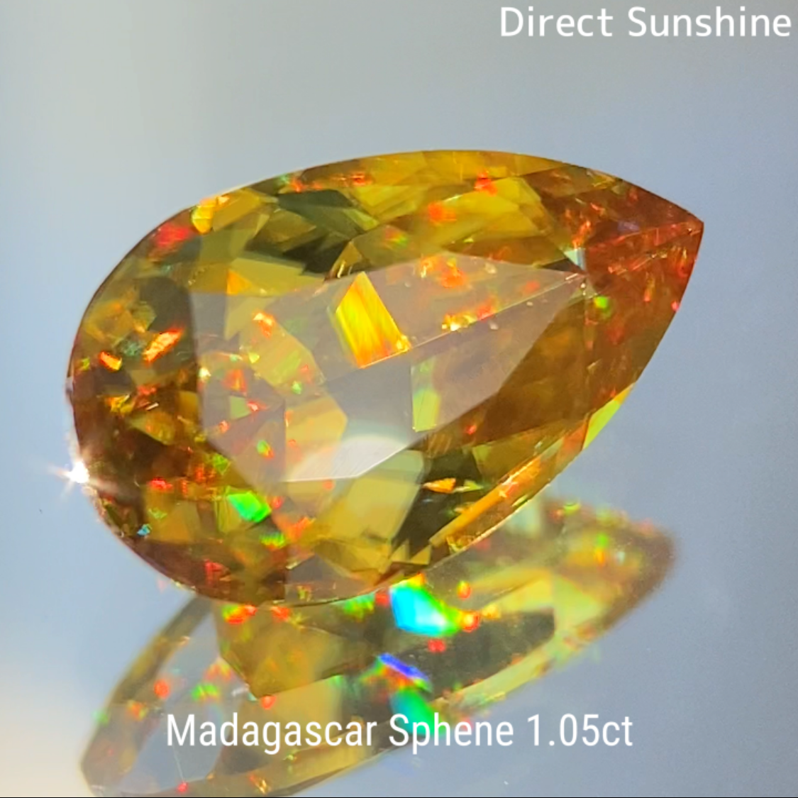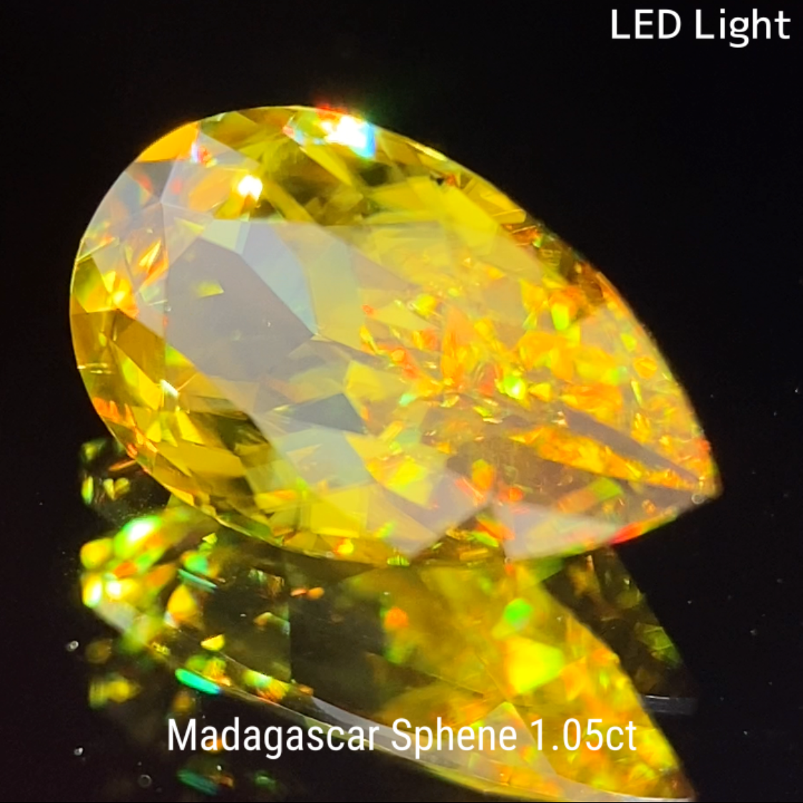 比較的明るいタイプのカラーで、特に強い光を当てなくても光の分散度の高いスフェーンならではのカラフルなファイアーが溢れます。