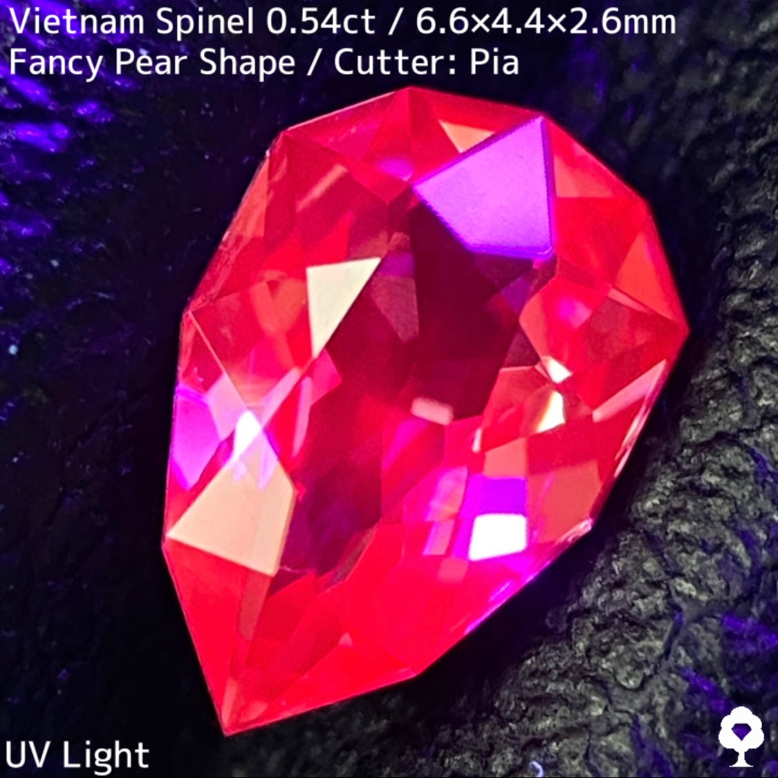 原石からつくりあげたベトナム産のスピネルで、赤みの強いパープルとピンクの間くらいの美色で透明度抜群の美結晶です。