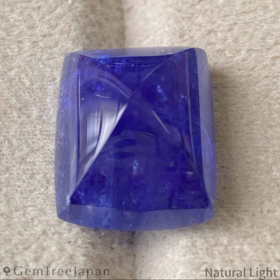 色のりの良いパープリッシュブルー地色に内包物の詰まった結晶を長方形に近いクッションシェイプの屋根のような形のシュガーローフに仕上げた作品です。