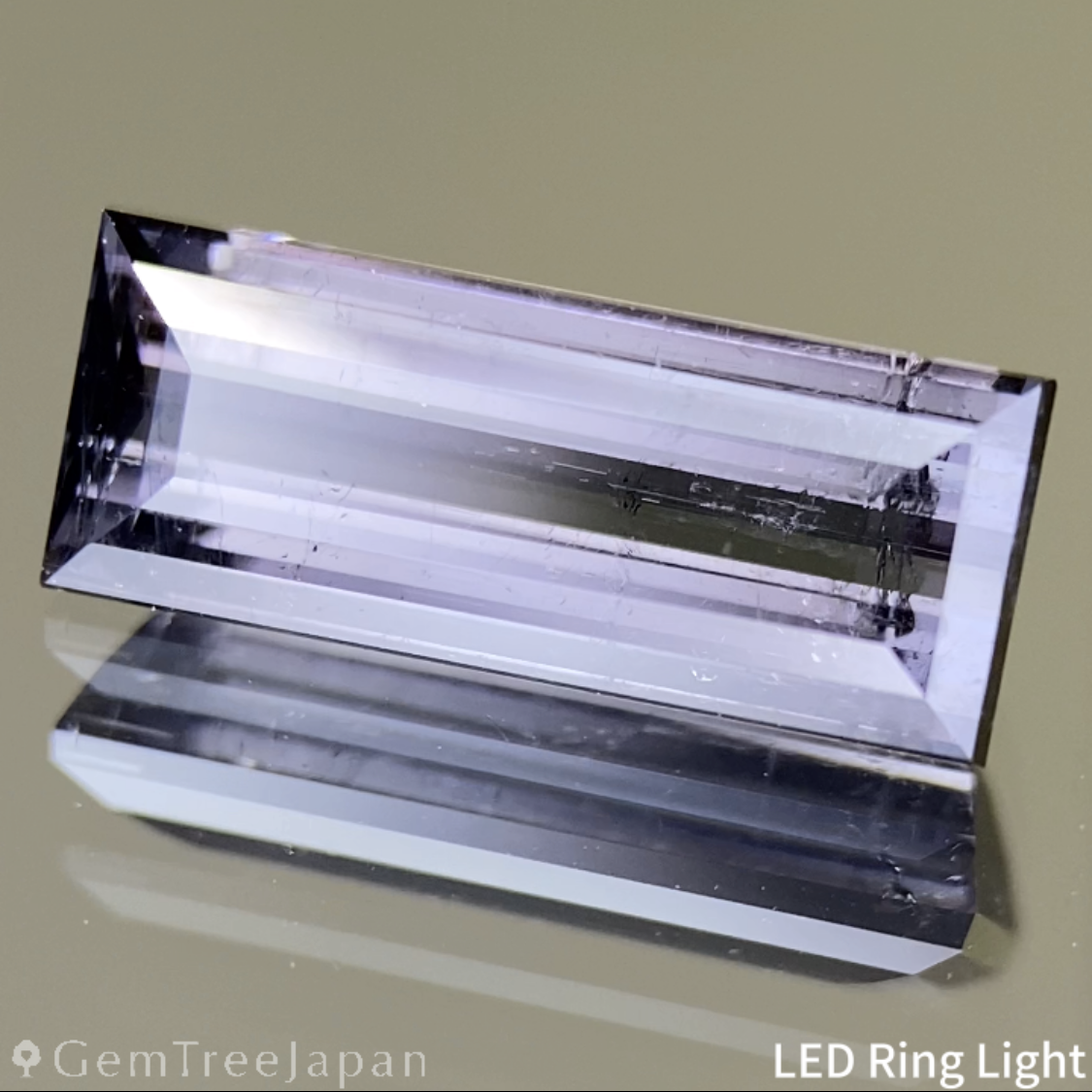 ほんのりヴァイオレットを噛んだグレーのナイジェリア産トルマリンで、端正なバゲットシェイプに仕上げた作品です。