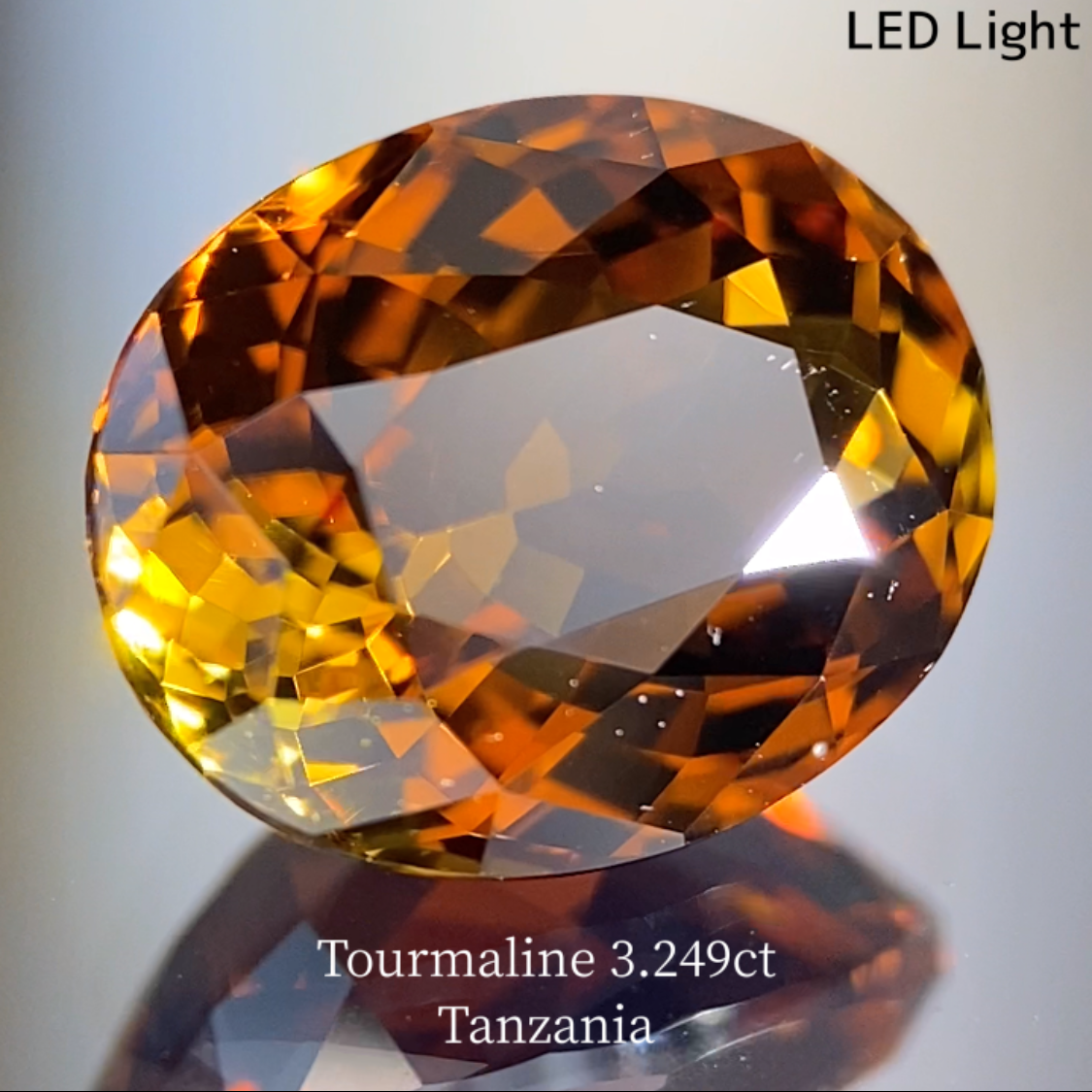 オレンジ・ブラウン・イエローに加えてわずかにグリーンが感じられるパーティ感あるドラバイト系のトルマリンで、3ctアップの端正なオーバルシェイプに仕上げられた作品です。