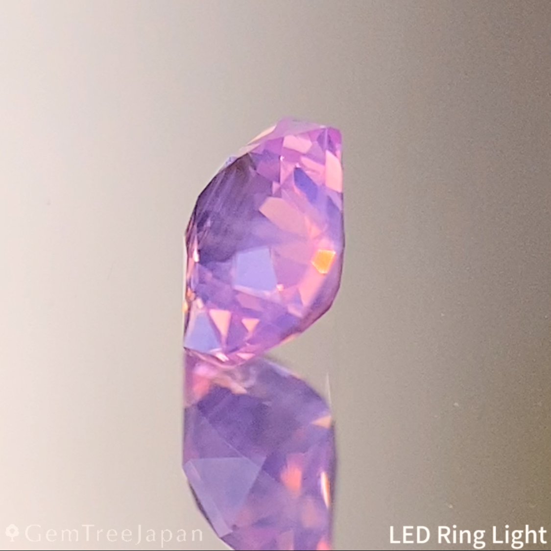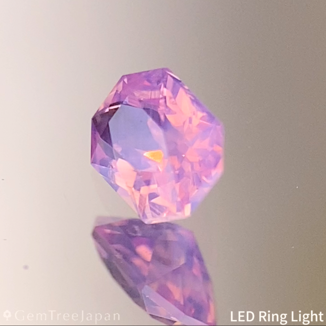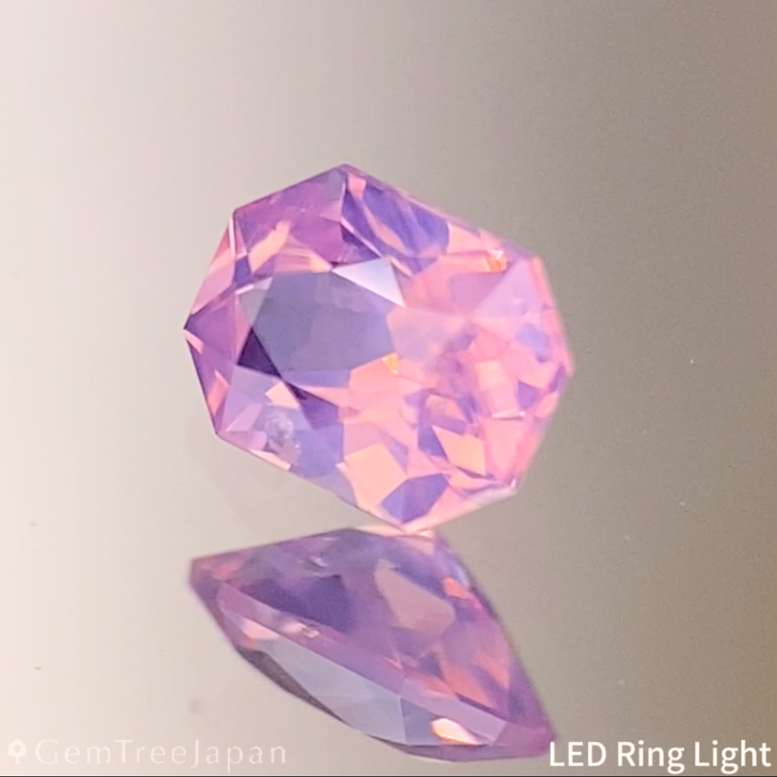 オレンジとピンクが混ざり合いそこにシルキーパープルのベールが全体にかかったベトナム・ルックイェン産の非加熱パパラチァサファイアで、休みを少し深めに切ったフラワーカットのオクタゴンに仕上げた作品です。
