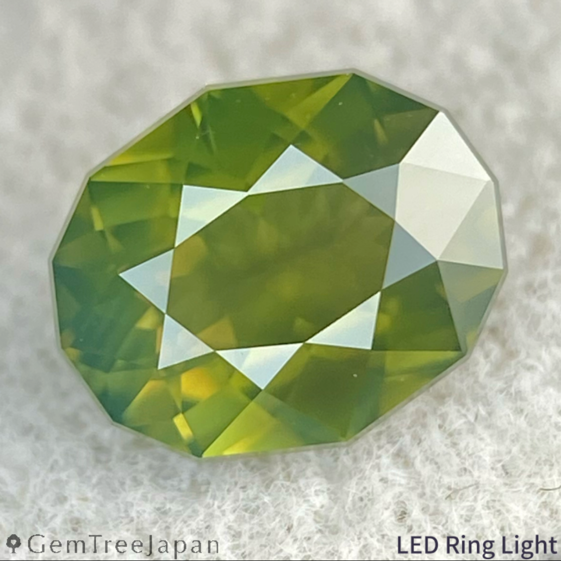 全体にシルキーなカーキの地色からネオン感あるオレンジーイエローの煌めきを放つマダガスカル産非加熱サファイアで、輪郭を細かく縁取ったファンシーオーバルに仕上げた作品です。
