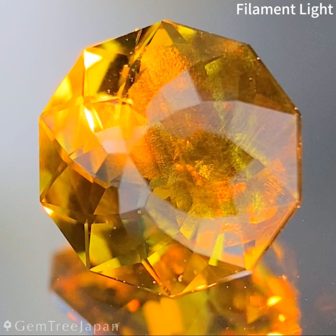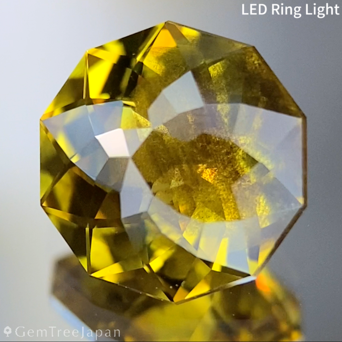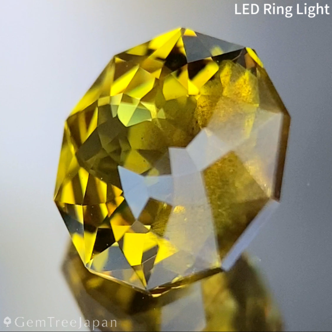 ひまわりのようなほんのりグリニッシュなイエローの結晶に、角度によって金色に光るブラウンのシルクインクルージョンの入ったナイジェリア産の非加熱サファイアで、テーブルを小さくしてフラワーカットを敷き詰めた輪郭を縁取った10角形ファンシーラウンドに仕上げた作品です。