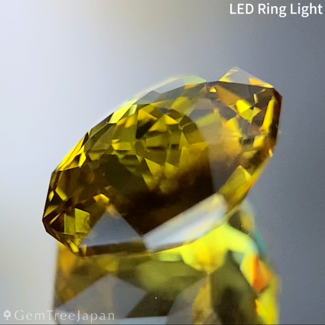 面白い内包物はありますが、石質は非常に良くてカラフルなファイアーがチラついて、地色も相まってスフェーンのように感じられる瞬間があります。