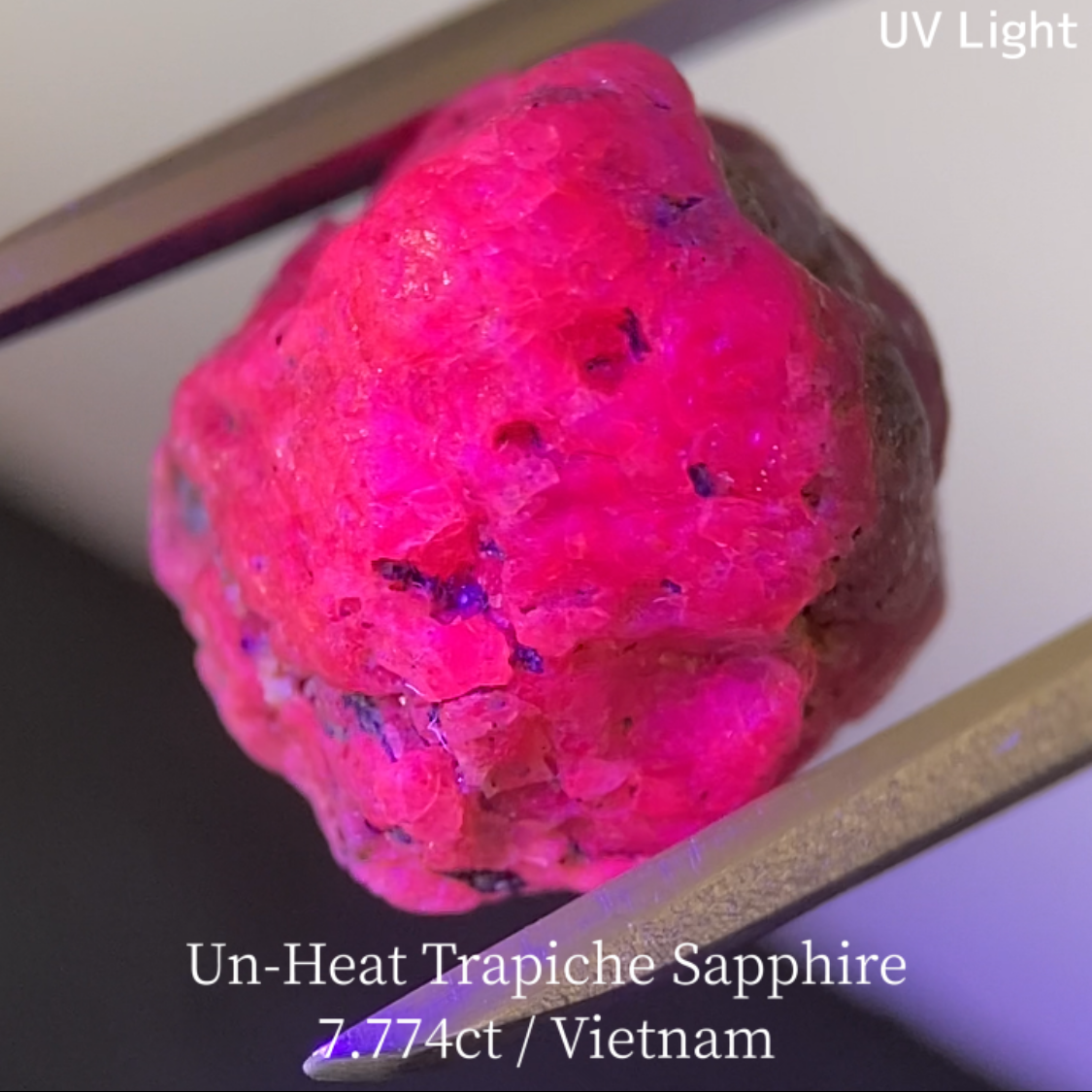 この原石はトラピッチェがある面のみを磨きその存在を際立たせたもので、UVライトを当てると蛍光反応によってより一層クッキリと確認することが出来ます。