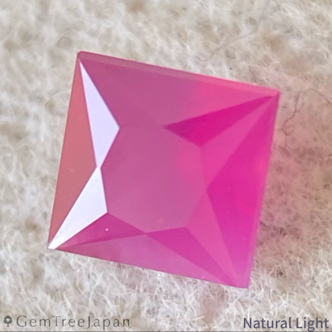 希少なビルマ産非加熱ルビーを贅沢にシャープで無駄のないプリンセスカットにしたGTJらしい仕上がりで、色のりの良いシルキーピンクが可愛らしく、シルクインクルージョンの光沢の煌めきを楽しめます。